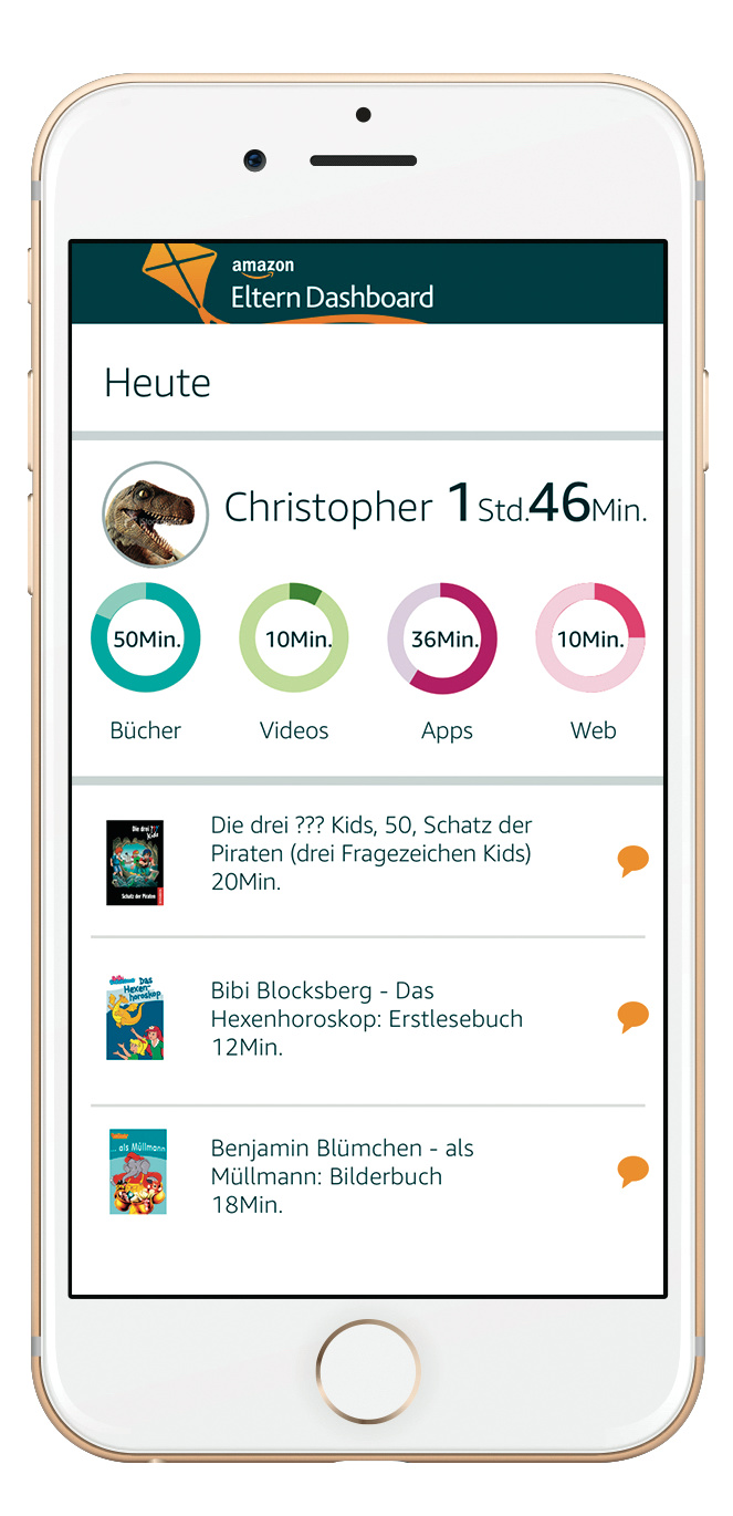 Eltern können in einem Dashboard vorgeben, wie lange das Kind sein Gerät insgesamt nutzen darf, jede Kategorie einzeln zeitlich beschränken – oder die Nutzung an Bedingungen knüpfen: Erst nach 30 Minuten Lesen etwa gibt die App dann den Zugriff auf andere Bereiche frei. Über das Dashboard können Eltern auch nachvollziehen, welche Inhalte der Nachwuchs wie lange genutzt hat. FreeTime Unlimited kostet für ein Kind 5 und für bis zu vier Kinder 10 Euro pro Monat (mit Prime: 3/7 Euro). (jo@ct.de)