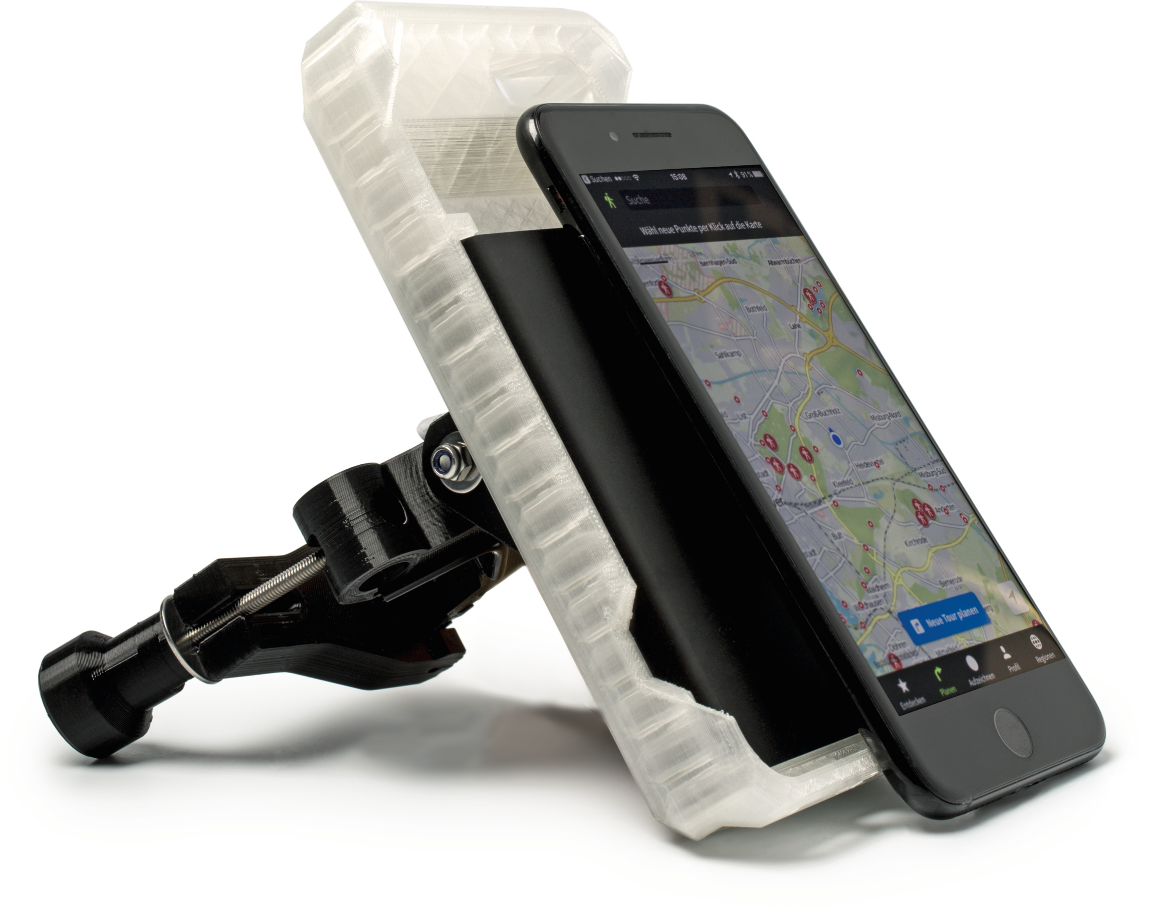 Die Ohno-Fahrradhalterung fürs iPhone kommt nicht aus China, sondern aus einem 3D-Drucker im oberpfälzischen Amberg. Sie hat eine Powerbank an Bord. Die ist allerdings viel kleiner als versprochen.