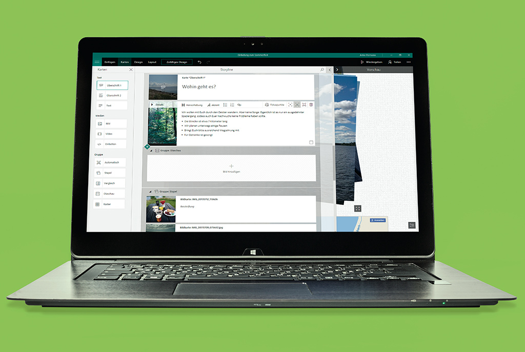 Mit dem kostenlosen Sway erstellt man innerhalb kürzester Zeit ansprechende Präsentationen: Inhalte reinkippen und ein paar Einstellungen vornehmen – den Rest macht das Programm. Das Ergebnis gleicht einer endlosen Papierrolle, die man nach und nach abwickelt – perfekt für alle Storytelling-Fans.