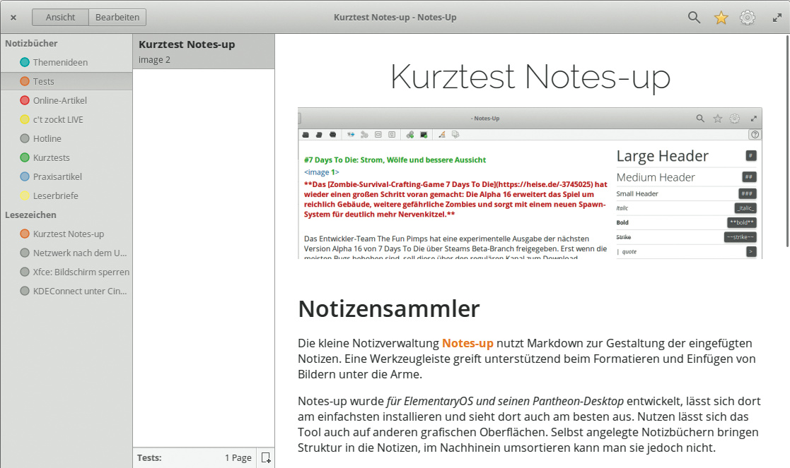 Notes-up wurde für ElementaryOS und seinen Pantheon-Desktop entwickelt, wo es sich am einfachsten installieren lässt und am besten aussieht. Nutzen kann man das Tool auch auf anderen grafischen Oberflächen. Notizen lassen sich in verschiedene Notizbücher einordnen, im Nachhinein umsortieren kann man sie jedoch nicht.