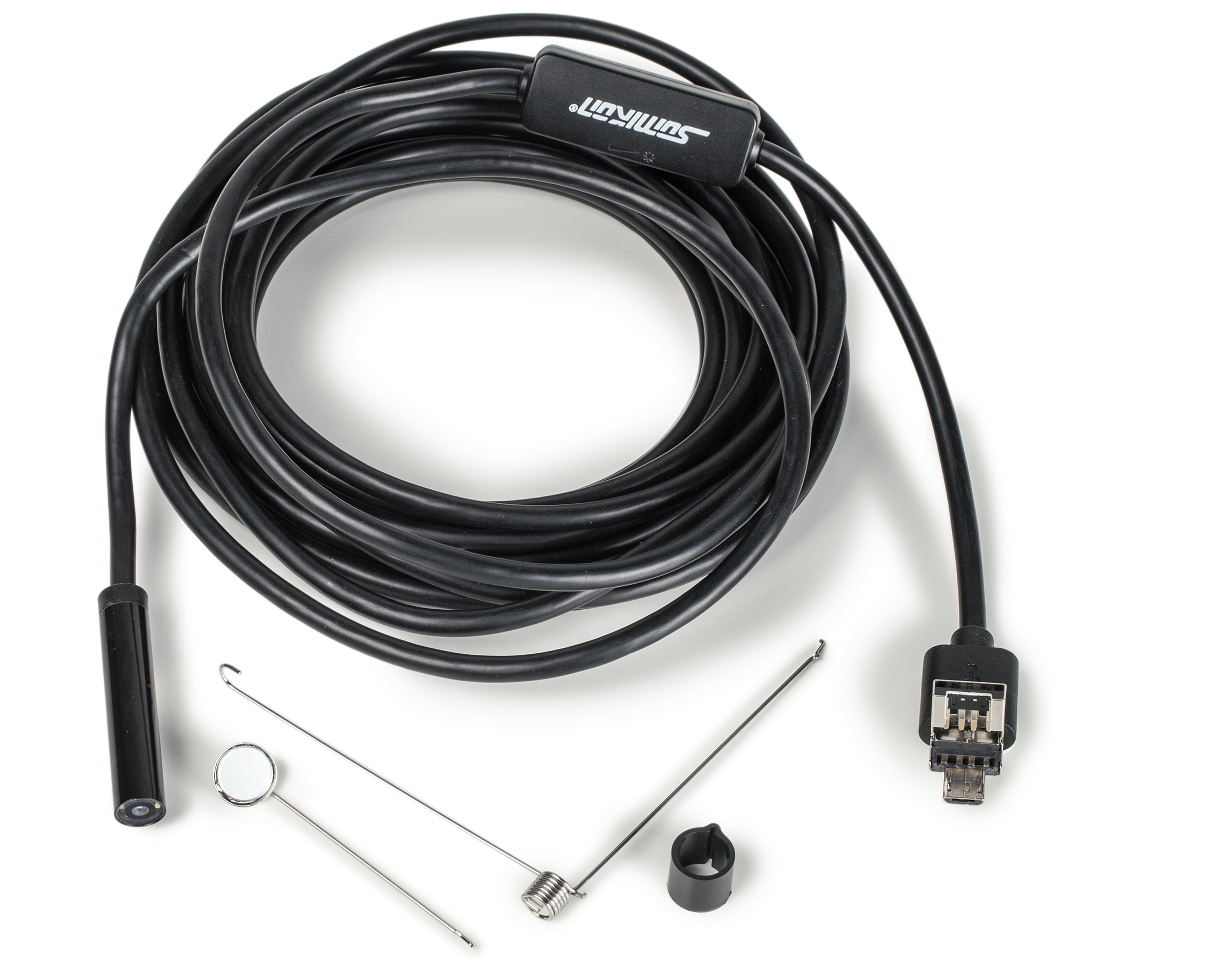 Für ein HD-Bild (1280 × 720 Pixel) holt man einfach das Android-Smartphone aus der Hosentasche. Der USB-Stecker am steifen 5-Meter-Kabel ist schlau gebaut: Nach Wegklappen einer Haube passt der Rest in eine Mikro-USB-Buchse. Über ein Rändelrad kann man die Helligkeit der integrierten Leuchten steuern, was mit maximal 1,3 Watt am Handyakku zehrt.