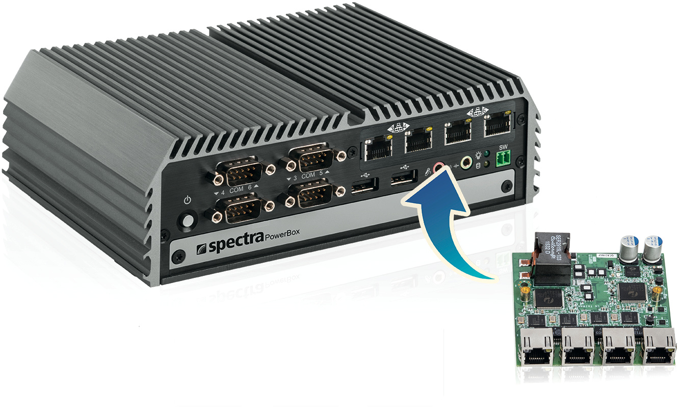 Die PowerBox 300 von Spectra versucht einen Kompromiss zwischen kompakter Bauform und Erweiterbarkeit: Der lüfterlose Mini-PC mit Intel Core i5-6300U oder Core i3-6100U (Dual-Core Skylake, 15 Watt) lässt sich mit Modulen erweitern, die je vier Ethernet-Ports herausführen, wahlweise mit Power-over-Ethernet oder verschraubten M12-Buchsen.