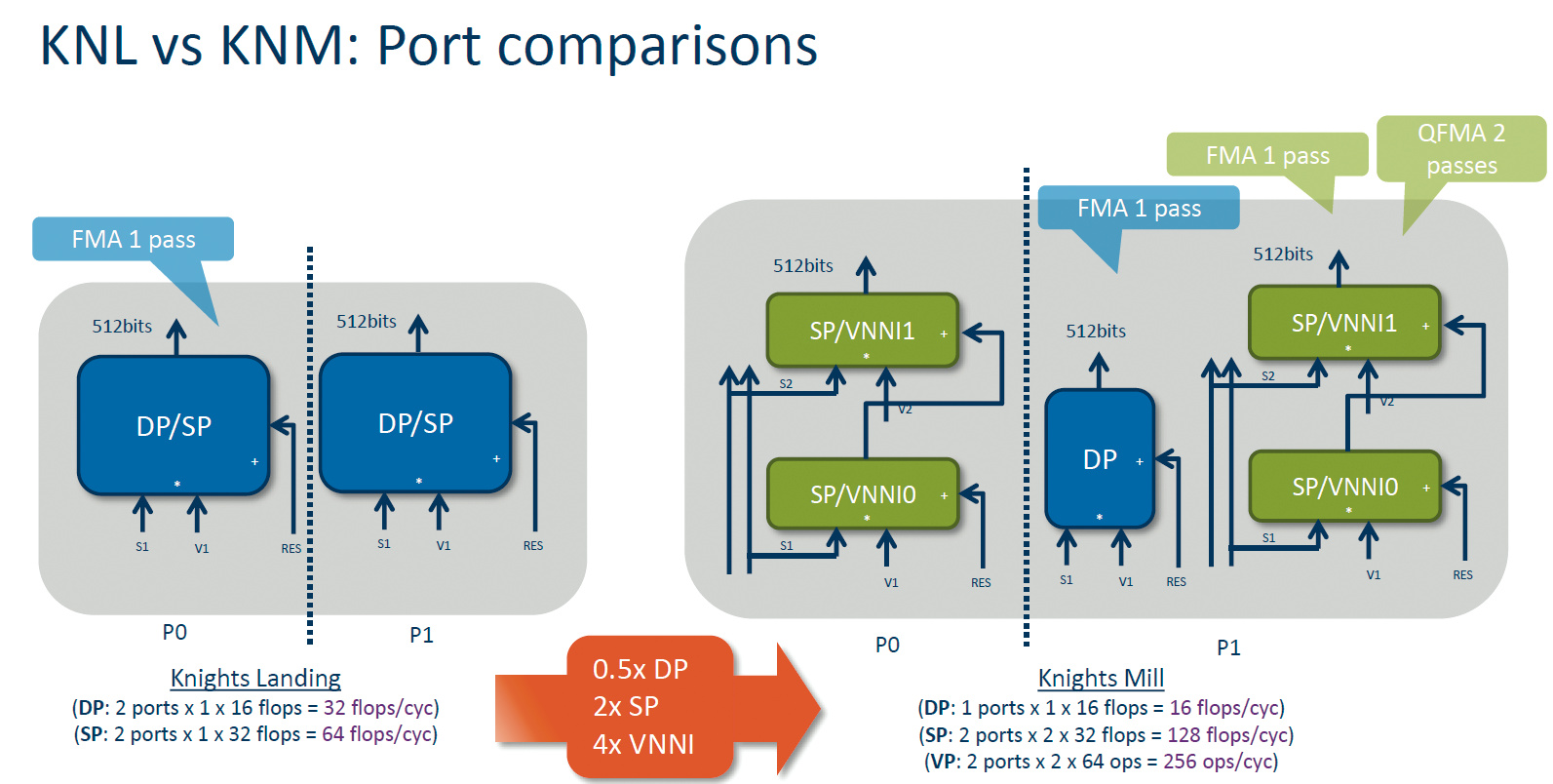 Eine doppeltgenaue Recheneinheit des Knights Landing wurde geopfert, damit vier neue SP/VNNI-Einheiten im Knights Mill Platz finden. Quelle: Intel