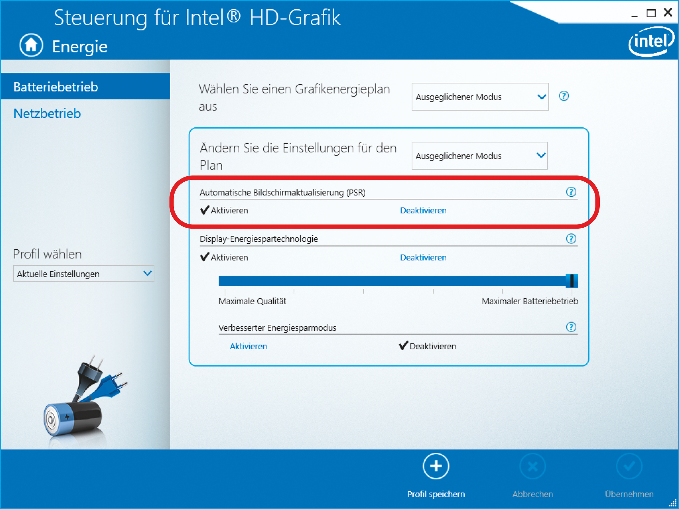 Um dennoch mit dem Notebook arbeiten zu können, müssen Sie in der Oberfläche des Grafiktreibers PSR abschalten. Diese öffnen Sie mit Rechtsklick auf den Windows-Desktop. Wählen Sie dort Grafikeigenschaften aus und wechseln Sie anschließend in der Treiberoberfläche die Energieoptionen. Deaktivieren Sie dort die automatische Bildschirmaktualisierung (PSR). Jetzt sollte sich das Display nicht mehr abschalten. (mue@ct.de)