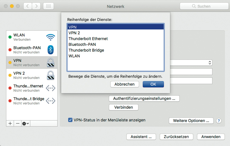 ¯!!! In einigen Fällen kann es vorkommen, dass macOS trotz dieser Option den Internet-Verkehr statt durch das VPN unverschlüsselt über die normale Ethernet- oder WLAN-Verbindung schickt. Für dieses Problem gibt es eine einfache Lösung: Nachdem Sie die VPN-Verbindung erstellt haben, loggen Sie sich ins VPN ein und öffnen die Netzwerk-Eigenschaften in den Systemeinstellungen. Klicken Sie dort auf das kleine Zahnrad unterhalb der Netzwerkliste und wählen Sie den Punkt „Reihenfolge der Dienste festlegen …“ aus. Per Drag & Drop ziehen Sie bei gedrückter Maustaste das VPN an die Spitze der Liste. Bestätigen Sie mit OK und klicken anschließend auf Anwenden in den Netzwerkeigenschaften. Nach dem Trennen und dem Wiederverbinden der VPN-Verbindung läuft der gesamte Internet-Verkehr über das VPN. (chh@ct.de)