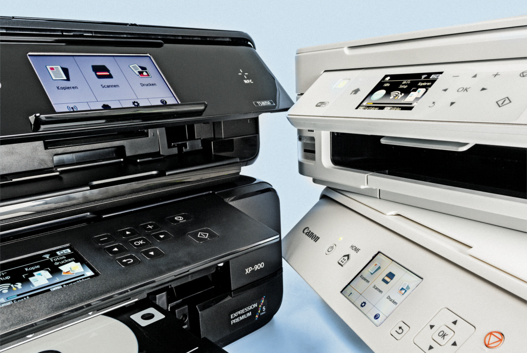 Auf Fotos spezialisierte 3-in-1-Multifunktionsdrucker – also Geräte ohne Faxfunktion und Vorlageneinzug auf dem Flachbett-Scanner – bieten mittlerweile nur noch Canon und Epson an. Wir haben je ein günstiges Einsteigermodell und ein besser ausgestattetes Mittelklasse-Gerät aus den aktuellen Heimdrucker-Serien zum Test ins c’t-Labor geholt: Von Canon sind das der Pixma TS5050 und der Pixma TS8050, von Epson wählten wir den Expression Home XP-445 und den Expression Premium XP-900.