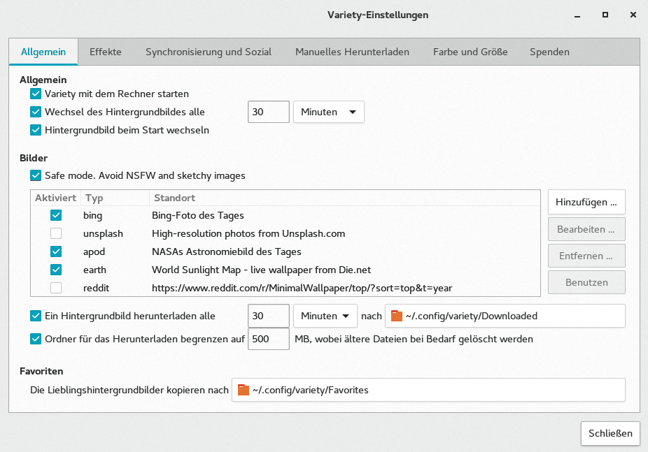 Mit Variety kommt Abwechslung auf den Desktop. Das Programm lädt Hintergrundbilder von Quellen wie RSS-Feeds, Reddit, Flickr und der NASA herunter und zeigt sie an. Auch lokale Dateien können als Bildmaterial dienen.