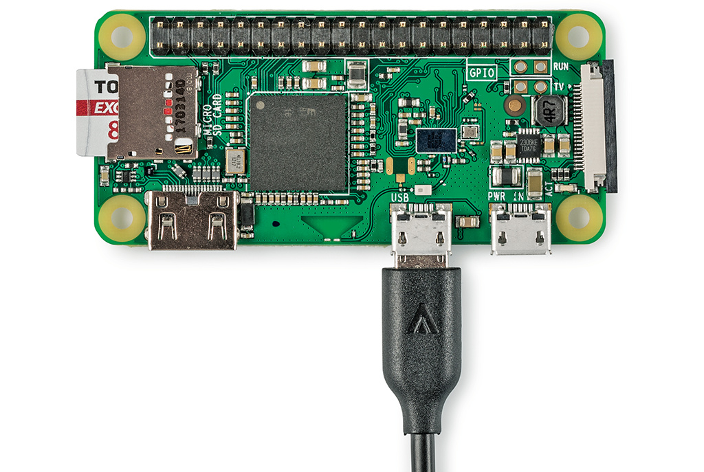 Meist soll der im Vergleich zum ausgewachsenen Raspi 3 leistungsschwache Raspi Zero nicht als Desktop-Ersatz dienen, sondern Tätigkeiten ohne Bildausgabe oder Tastatureingabe ausführen – etwa die Steuerung des Smart Home. Diese Betriebsart nennt man „headless“. In solchen Fällen kann man sich das Hantieren mit Adaptern, Maus, Tastatur und Monitor sparen. Zur Inbetriebnahme reichen ein Micro-USB-Kabel und ein PC aus.