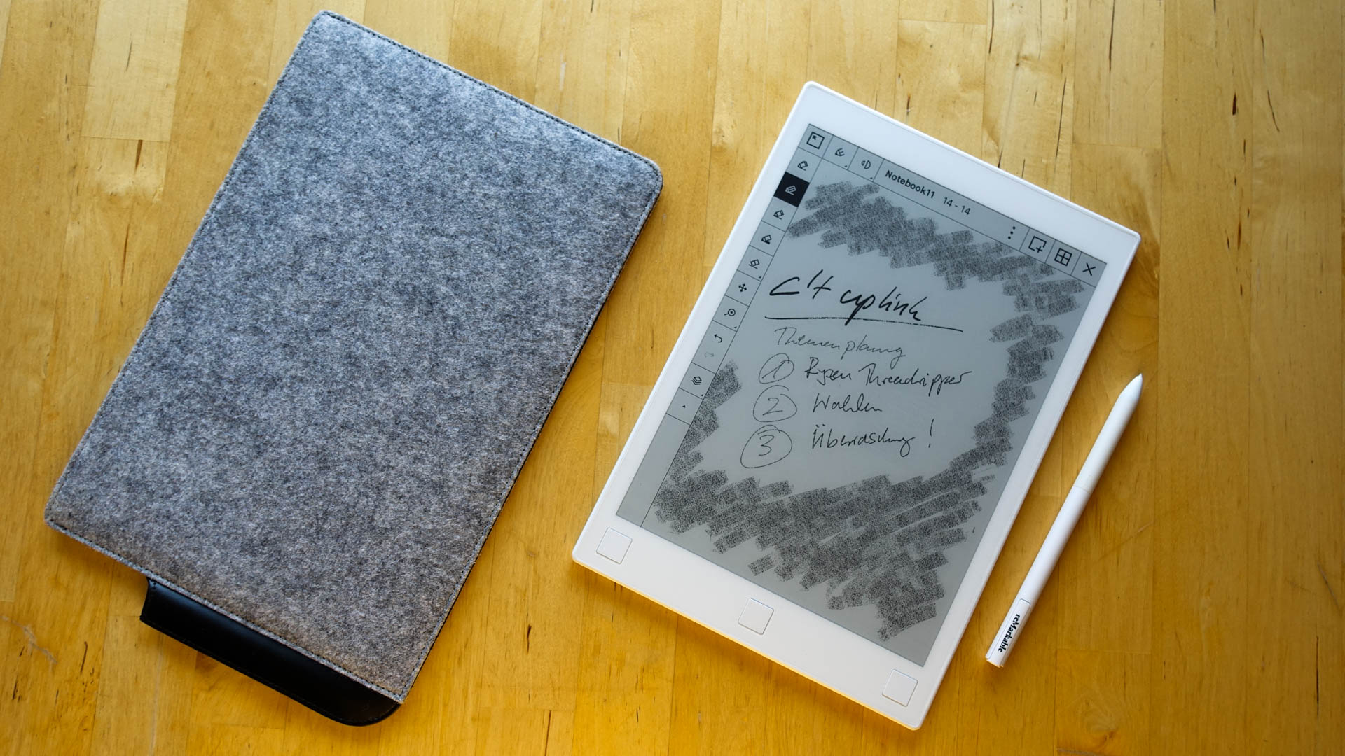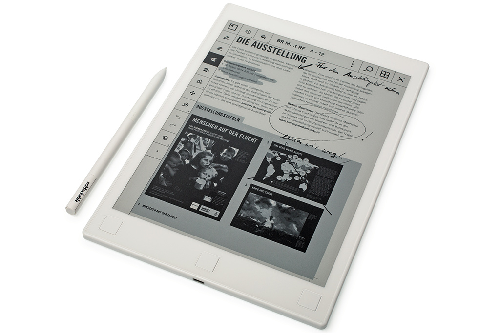 Die 10,3 Zoll Diagonale entsprechen nicht ganz DIN A4, unsere Test-PDFs in diesem Format blieben aber in allen Fällen trotz Verkleinerung gut lesbar. Per Touch und Tasten navigiert man durch die Menüs, während man mit dem beiliegenden Stift Textstellen markiert, Notizen an den Rand von PDFs sowie E-Books schreibt und Notizbücher führt.