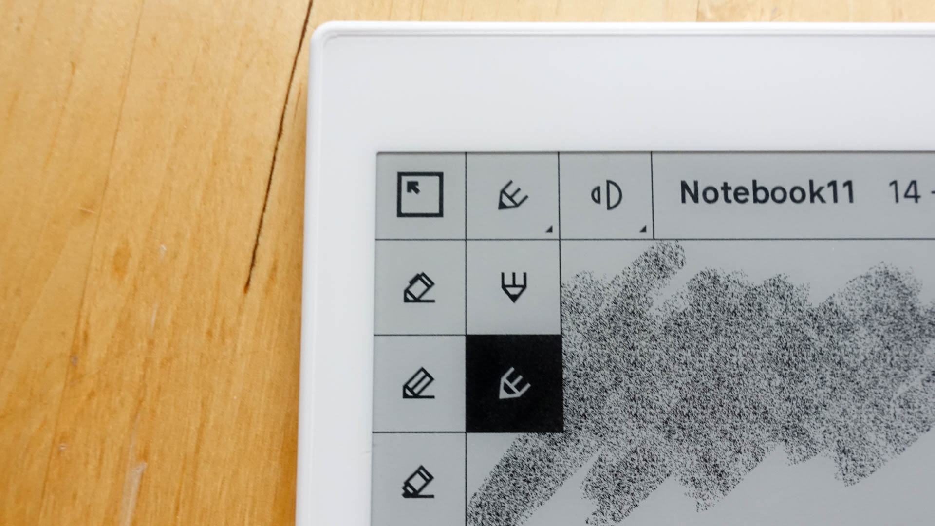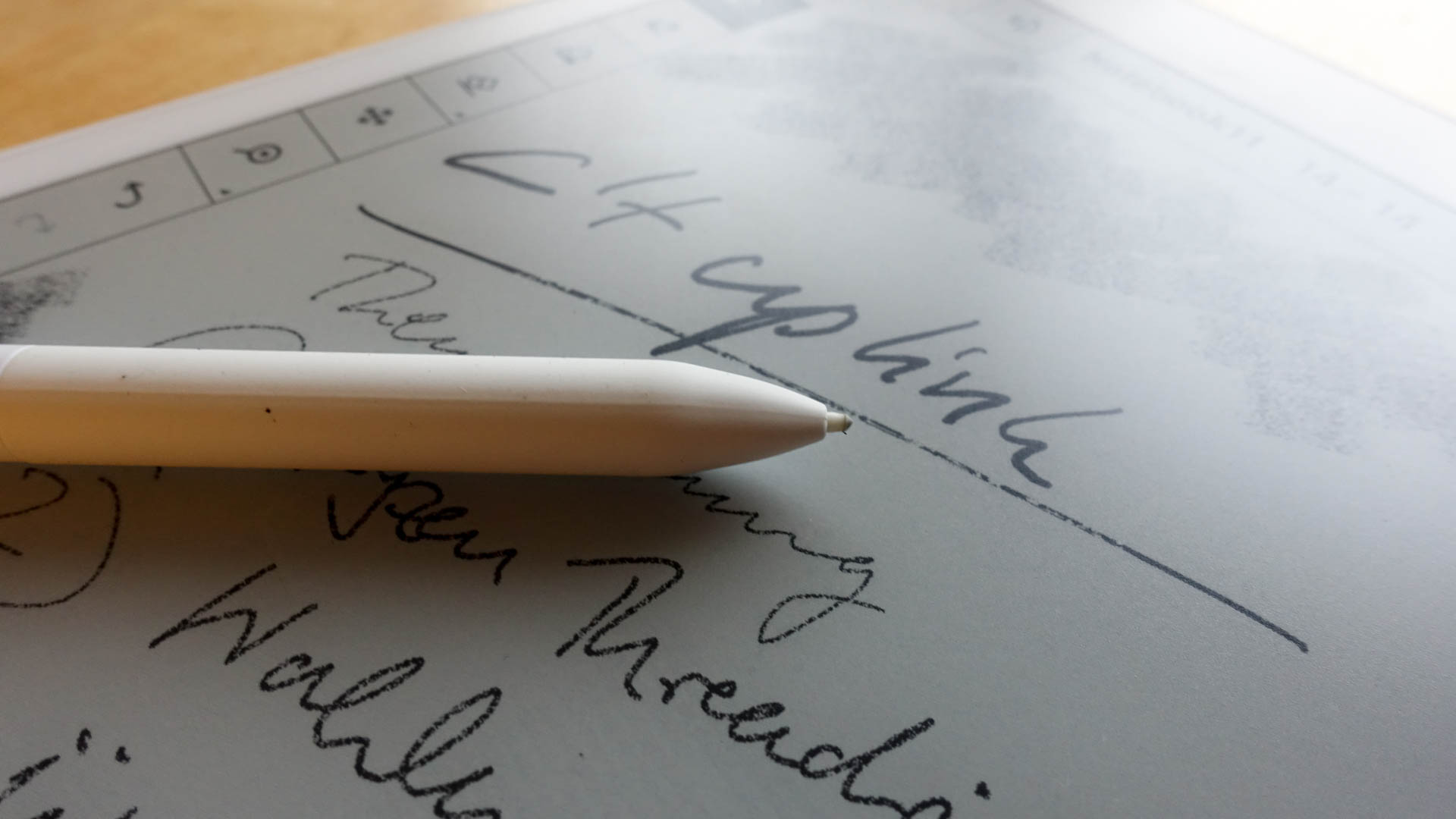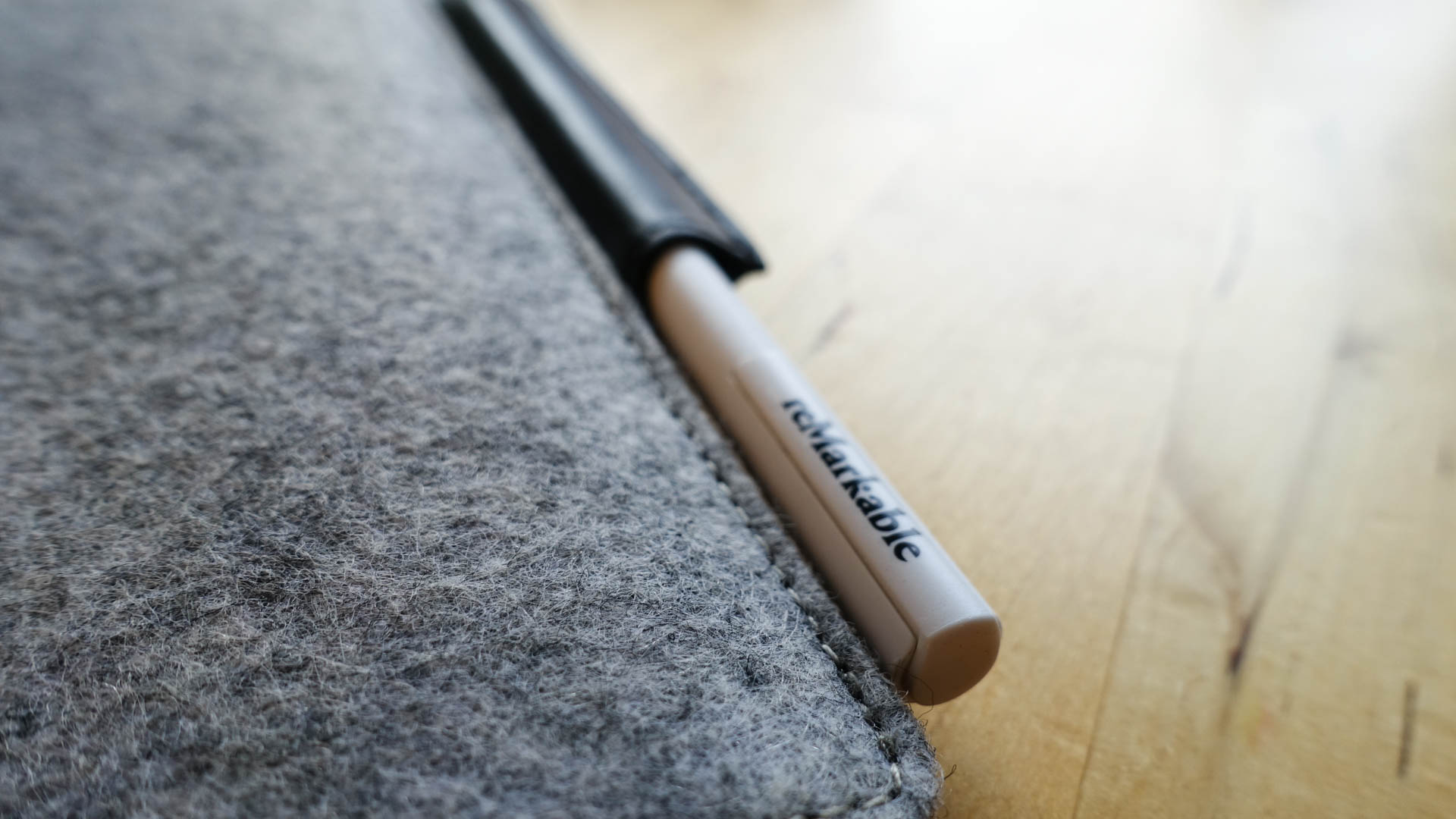 Fürs Schreiben und Zeichnen ist ein Wacom-Digitizer integriert, der mit jedem beliebigen Wacom-Stylus kompatibel sein sollte. Der beiliegende Stift – in etwa so groß und schwer wie ein Kugelschreiber – führt Striche präzise aus, nur in den Ecken weichen Stiftspitze und Gezeichnetes bis zu einem Millimeter voneinander ab. Je nach Druck und Stiftneigung zieht das Tablet Linien dicker oder dünner. Obwohl E-Ink-Panels sonst als eher träge gelten, ist die Latenz beim Remarkable minimal. An sich kann man deshalb darauf auch prima zeichnen, aufgrund des Schwarzweiß-Displays und der geringen Auswahl an virtuellen Stifttypen macht das aber weniger Spaß als auf einem iPad Pro oder Galaxy-Note-Tablet. Einen Stift-Slot gibts nur an der Filzhülle, die 79 Euro extra kostet.