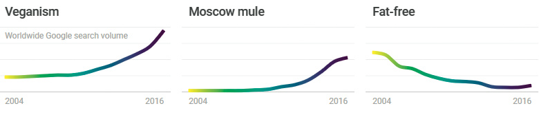 Zusammen mit den Datenvisualisierern von Truth & Beauty zeigt Google in der weiteren spannenden Aufbereitung The Rhythm of Food Nahrungsmitteltrends der vergangenen Jahre, extrahiert aus Suchmaschinenanfragen von Nutzern weltweit. Google hat etwa gemessen, dass das Interesse nach veganer Ernährung und sogenannten „Superfood-Produkten“ in den letzten Jahren exponentiell gestiegen ist, die Menschen sich aber in nahezu demselben Maß immer weniger für fettarme Ernährung begeistern. Außerdem lassen Jahreszeiten-Verteilungen erkennen, wie die Zubereitung saisonaler Nahrungsmittel in der Suchmaschine abgebildet ist: Im Juni etwa wird vermehrt nach Blaubeer-Rezepten gesucht, ab September nach Rezepten für Kürbis. (hob@ct.de)