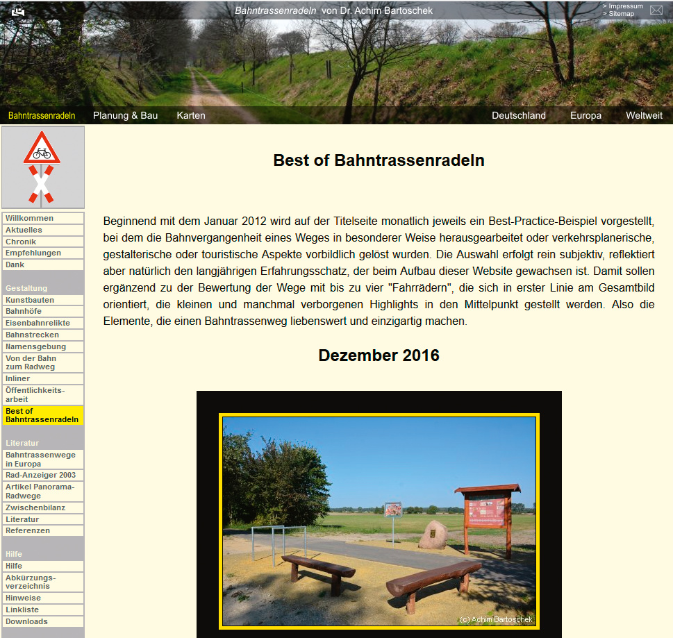 In den letzten Jahrzehnten hat die Deutsche Bahn abseits der Großstädte tausende Kilometer Eisenbahntrassen aufgegeben. Einige der landschaftlich attraktiven Strecken haben Länder und Kommunen übernommen und zu Fernwegen für Radwanderer umfunktioniert. Sie bieten auch in hügeliger bis bergiger Landschaft entspanntes Radeln ohne viele Steigungen. Der Leverkusener Achim Bartoschek hat viele Bahntrassen-Radwege abgefahren und beschreibt sie auf seiner Website Bahntrassenradeln. (hob@ct.de)