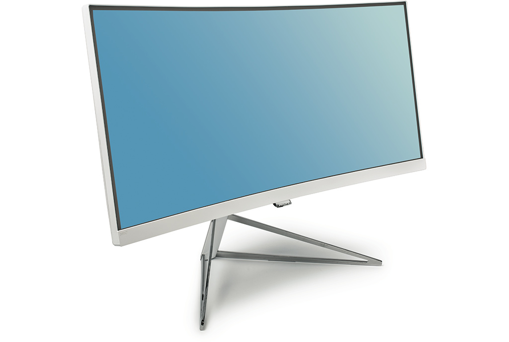 Das VA-Panel im dünnen weißen Rahmen zeigt 3440 × 1440 Bildpunkte und taugt mit seinem Krümmungsradius von 1800 mm gut für einen Einzelarbeitsplatz, nicht jedoch für die Gruppenarbeit oder Präsentationen. Freunde des futuristischen Designs der 60er Jahre werden am wackelfesten Fuß ihre ästhetische Freude haben. Der Bildschirm lässt sich nur neigen und in der Höhe verstellen. Auf direkte Berührungen reagiert er mit längeren Nick- oder Gierbewegungen.