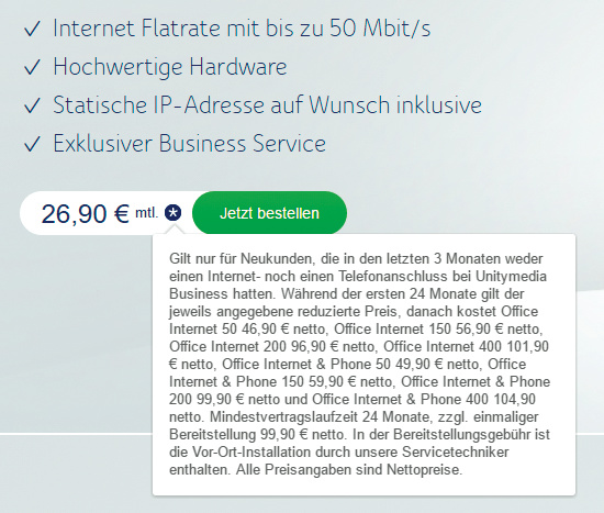 Anders herum dürfen Privatkunden meist keine Geschäftskundenanschlüsse buchen, auch wenn sie gerne von Vorteilen wie einer festen IP-Adresse profitieren würden. Fast alle Provider prüfen Anträge und lassen sich Gewerbeanmeldungen oder ähnliche Nachweise vorlegen.