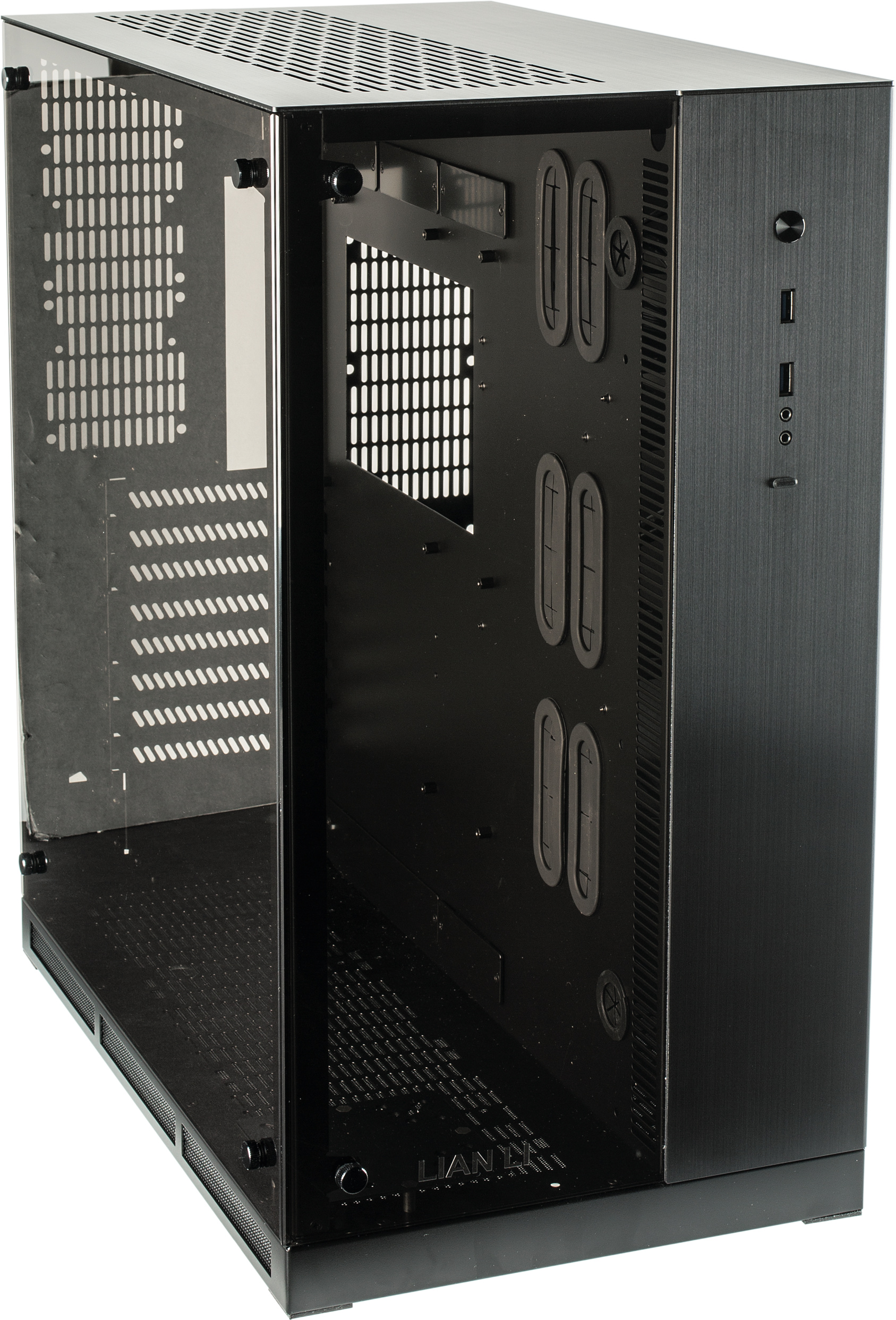 Das überbreite Tower-Gehäuse von Lian Li wiegt mit mehr als 10 kg so viel, wie es die wuchtigen Abmessungen erwarten lassen. Das linke Abteil des PC-O11 ist von außen einsehbar und bietet Platz für ein Mainboard bis zur E-ATX-Größe, eine SSD sowie 39 cm lange Grafikkarten und Wärmetauscher einer Wasserkühlung.