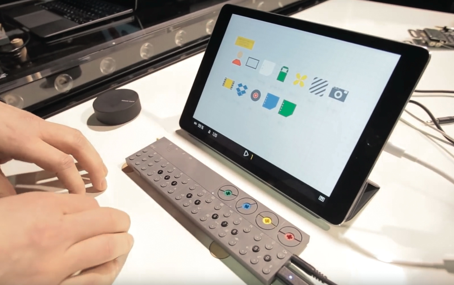 Teenage Engineering hat neue Funktionen seines kommenden Sequenzers OP-Z vorgestellt. Die graue Box nimmt per USB oder Bluetooth Kontakt zum iPad auf, das mit einer zugehörigen App als Bildschirm fungiert. Auf acht Spuren lassen sich verschiedene Instrumente einspielen, deren Klangerzeugung und Steuerung komplett im OP-Z laufen. Ein virtueller Tape-Recorder nimmt die Spuren auf und verfremdet sie mit verschiedenen Scratch-, Pitch- und Stutter-Effekten.