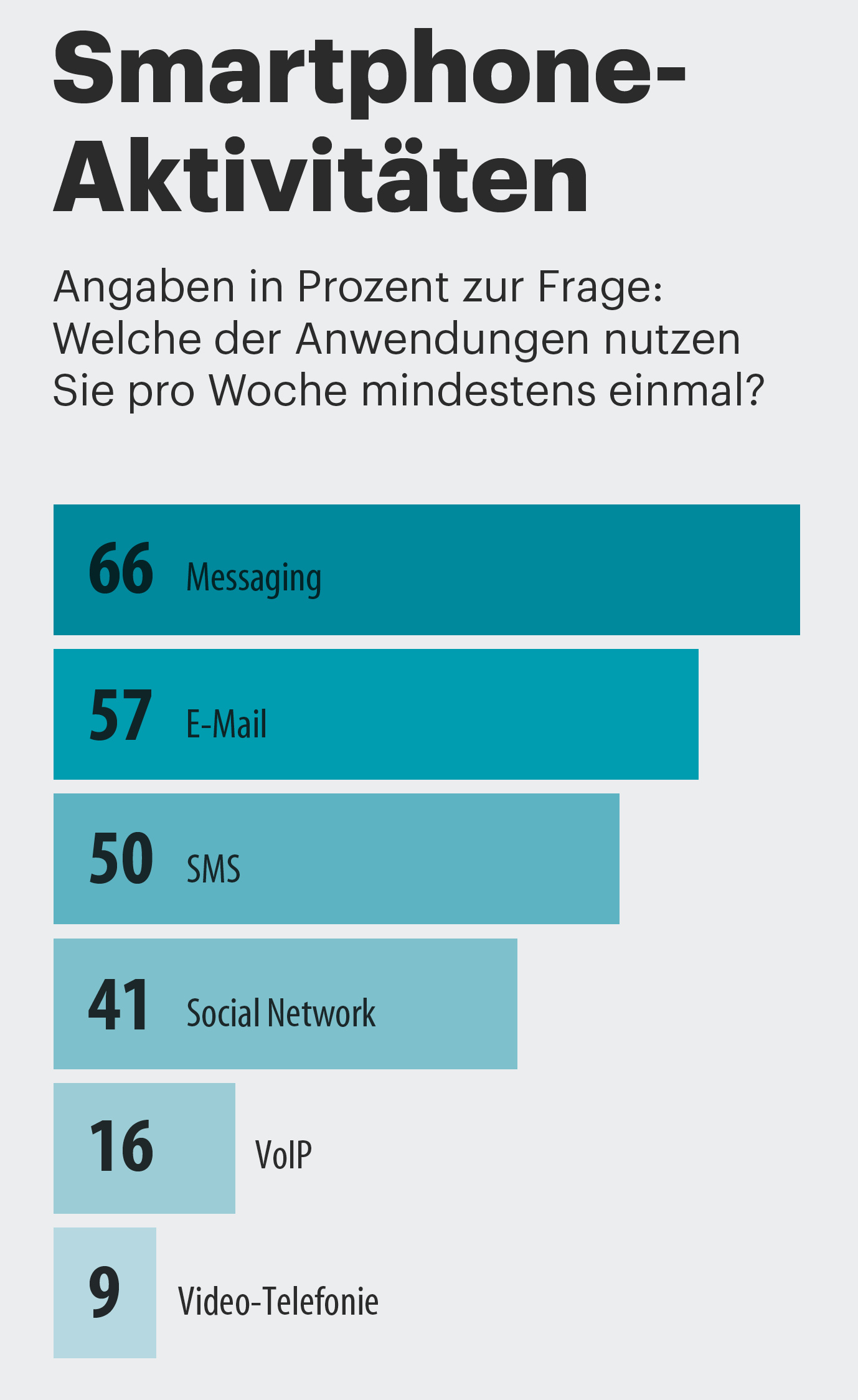 Dabei nimmt der Mitteilungsdrang keineswegs ab – er wird nur anders kanalisiert, vor allem schriftlich. Die britische Regulierungsbehörde Ofcom führt in ihrem International Communications Market Report auf, dass 66 Prozent der in Deutschland befragten Smartphone-Nutzer wöchentlich mindestens einmal per Smartphone chatten [1]. Aber auch Telefonieren abseits der klassischen Kanäle nimmt zu: 16 Prozent der Befragten nutzen Voice over IP mindestens einmal wöchentlich (siehe Grafik „Smartphone-Aktivität“ auf S. 112).