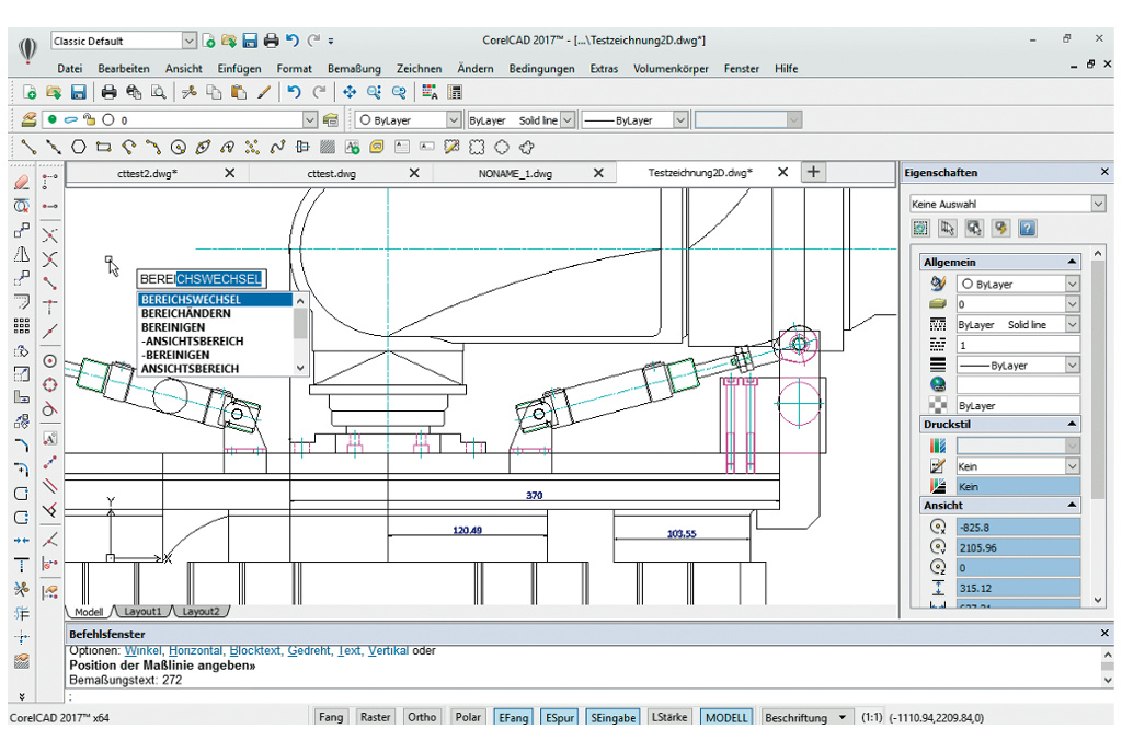 Mit CorelCAD erstellt man zweidimensionale technische Zeichnungen und konstruiert dreidimensionale Modelle. Löblich: Für jede der beiden Anwendungsfelder gibt es eine individuelle Arbeitsumgebung, die man auf Wunsch noch weiter an die eigenen Vorlieben anpassen kann. Die jüngste Version der CAD-Software hat mehrere Neuerungen erhalten, auf die Anwender gewartet haben: Automatisches Vervollständigen von getippten Befehlen ist ein Beispiel, der Befehl „BereichÄndern“ ein weiteres. Letzterer verschiebt Objekte wie Textkästen und Tabellen mit wenigen Mausklicks von einem Layout-Blatt in einen Modell-Arbeitsbereich. Im Arbeitsalltag will man beides bereits nach kurzer Zeit nicht mehr missen.