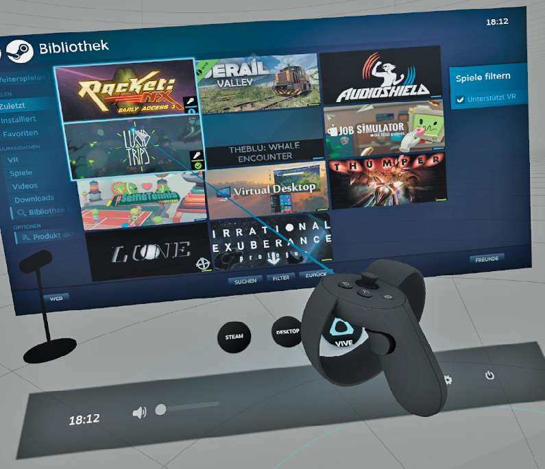 Valve schafft dagegen Fakten in Sachen VR-Inhalte: die hauseigene Verteilungsplattform Steam, seit Jahren Marktführer für digitale Spiele, bietet einen Virtual-Reality-Modus namens SteamVR an. Damit lassen sich Spiele und Anwendungen in VR starten, unterbrechen und beenden. Dies entspricht in seiner Funktion einem rudimentären VR-Betriebssystem.