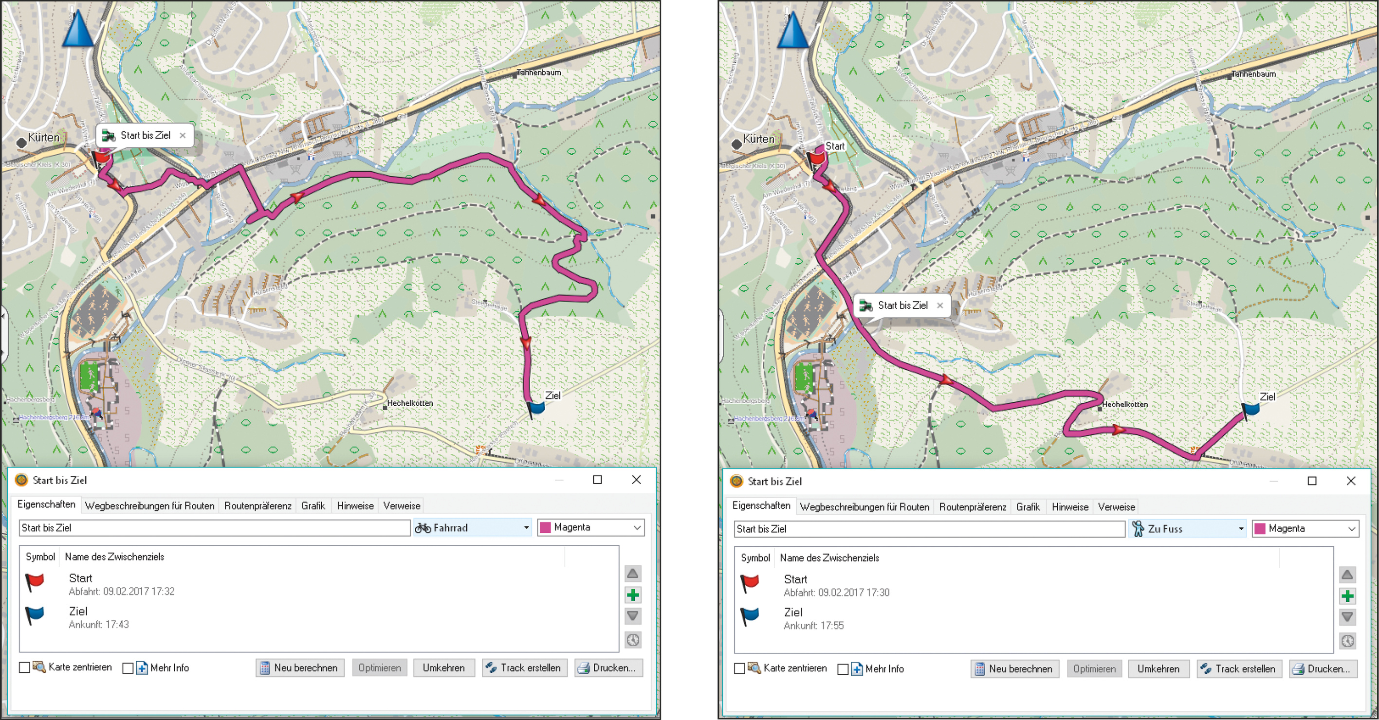 Bei einer Route hingegen erhält das GPS-Gerät nur Start und Ziel. Den Streckenverlauf berechnet es dann intern auf Basis der Karte im Gerät sowie anhand Ihrer Vorgaben. Falls Sie am PC beispielsweise eine OpenStreetMap-Karte und auf dem GPS-Gerät eine Topo-Karte von Garmin nutzen, haben PC und GPS-Gerät unterschiedliche Voraussetzungen zum Berechnen der Route – entsprechend unterscheiden sich die Ergebnisse.
