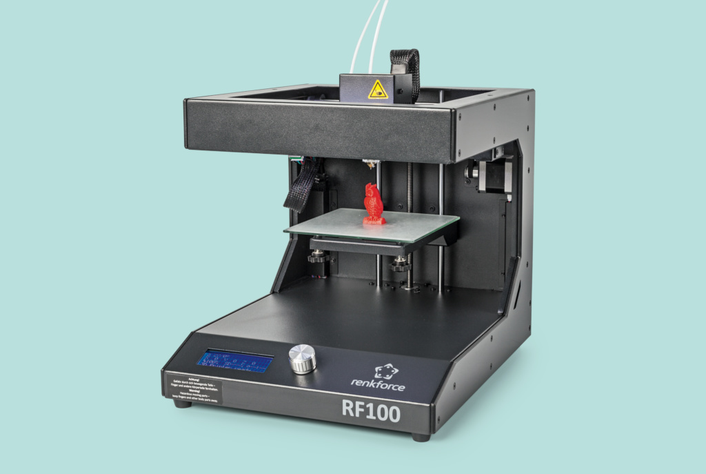 Die 3D-Drucktechnik wird seit Jahren auch für Privathaushalte gepriesen, durchsetzen konnte sie sich aber nicht, wie eine Studie vom Branchenverband Bitkom kürzlich zeigte [1]. Ein wesentlicher Faktor für die Abstinenz sind die Preise. Gute Geräte kosten selbst als Bausätze deutlich vierstellige Beträge und erfordern dabei oft noch jede Menge handwerkliches Geschick. Fertiggeräte gibt es auch aus fernöstlichen Schmieden kaum für unter 500 Euro. Umso gespannter waren wir auf den von Conrad Ende vergangenen Jahres angekündigten Renkforce RF100, der für nur 300 Euro angeboten wird.