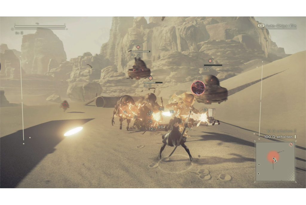 Der Spieler steuert aus dem Trio meist die quirlige 2B. Zum Tross der drei gehören auch Drohnen, die das Terrain scannen, Nachrichten vom Hauptquartier abspielen und Angreifer mit Dauerfeuer beregnen. Wie im jüngsten Final Fantasy reist die Helden-Crew frei durch eine offene Spielwelt. Dank der Minimap hat man die aktuelle Quest stets im Blick und findet schnell den Weg zum nächsten Ziel.