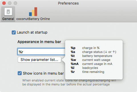 Nachdem Sie coconutBattery heruntergeladen und entpackt haben, verschieben Sie es ins Verzeichnis „Programme“ und starten es von dort aus. Nun hangeln Sie sich übers Menü in die Einstellungen („Preferences“) und setzen im Abschnitt „General“ das Häkchen bei „Launch at Startup“, damit das Tool beim Systemstart automatisch geladen wird. Im Feld darunter können Sie mittels Parametern festlegen, wie coconutBattery die Restladung darstellt. Um von der voreingestellten Prozentanzeige auf die Restlaufzeit umzustellen, ersetzen Sie %p durch %r. Falls noch nicht geschehen, setzen Sie auch noch das Häkchen bei „Show icons in menu bar“, damit sich das Tool in die Menüleiste einklinken darf. Das nun überflüssige Batterie-Icon von macOS blenden Sie aus, indem Sie in den Systemeinstellungen unter „Energie Sparen“ den Haken vor „Batteriestatus in der Menüleiste anzeigen“ entfernen. (bkr@ct.de)