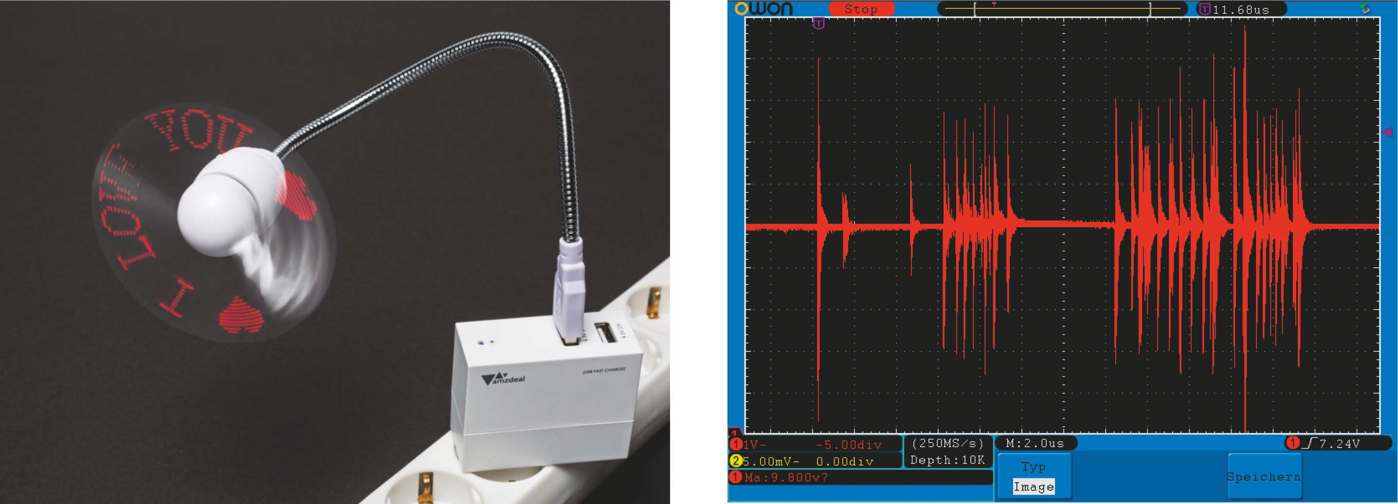¯!!! Ja, grundsätzlich schon. Wir haben einen vermutlich baugleichen USB-Ventilator an ein 5-Volt-Netzteil angeschlossen und mit dem Oszilloskop die Spannung gemessen. Dabei traten kurze Spannungsimpulse auf, von denen manche über 10 Volt lagen. Diese Impulse dauerten jeweils weniger als eine Mikrosekunde und transportieren deshalb vermutlich wenig Energie. Doch es mag sein, dass manche Notebooks und PCs diese hohen Störspannungen trotzdem nicht vertragen – USB arbeitet schließlich nur mit 5 Volt.