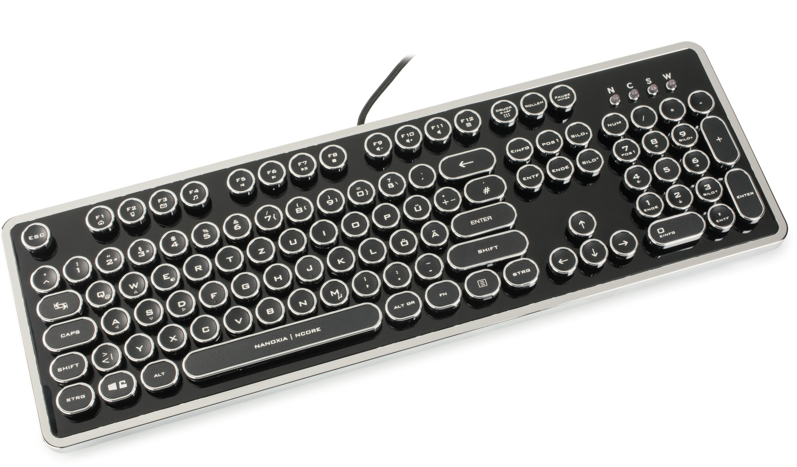 Weil es Frickelarbeit ist, eine Steampunk-Tastatur mit Schreibmaschinentasten zusammenzubasteln, kosten gut gemachte Fertig-Tastaturen 250 Euro und mehr. Da wirkt die Ncore Retro von Nanoxia für 110 Euro wie ein Schnäppchen. Sie besitzt abnehmbare Tasten, mechanische Schalter, pollt USB mit 1000 Hz und ist spritzwassergeschützt. Was will man mehr?