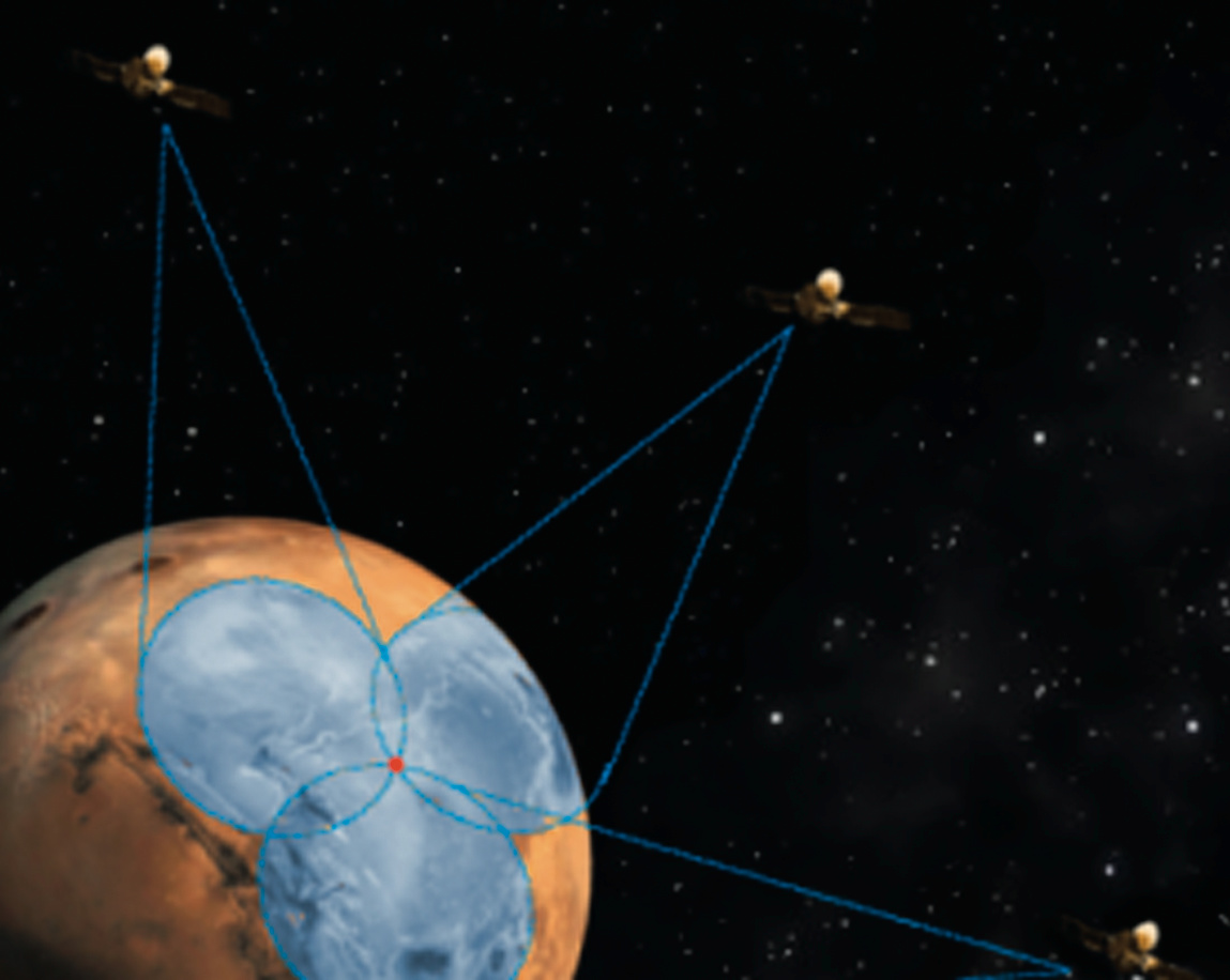 Drei Satelliten dienen der Ortsbestimmung, ein weiterer dem Zeitabgleich: Das Mars-GPS soll nach ähnlichen Prinzipien arbeiten wie GPS auf der Erde.