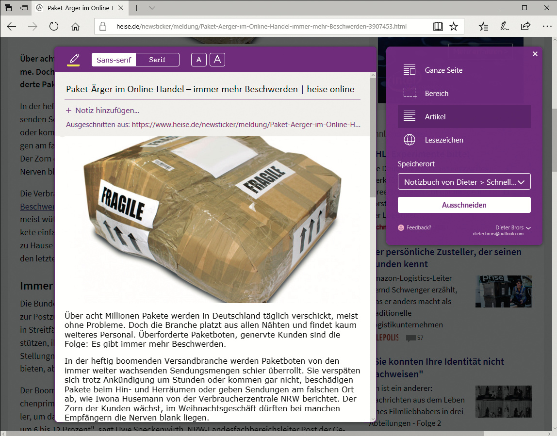 ¯!!! Das klappt mit der Edge-Erweiterung „OneNote Web Clipper“, die Sie kostenlos im Microsoft-Store finden. Klicken Sie dazu in Edge oben auf das Symbol mit den drei Punkten, wählen Sie dann „Erweiterungen“ und anschließend „Erweiterungen aus dem Store abrufen“. Dort suchen Sie dann nach „OneNote Web Clipper“. (db@ct.de)