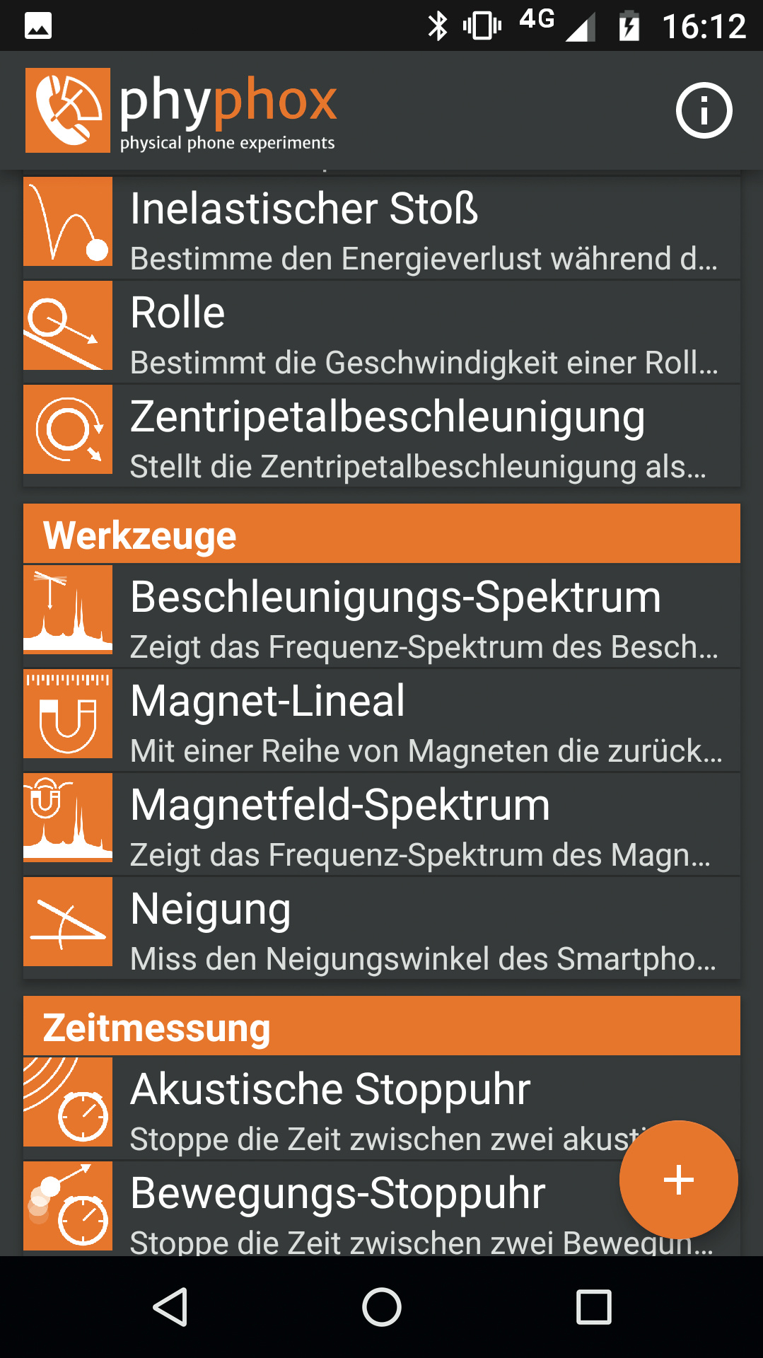 Schnell wird klar: In der ersten Rubrik namens „Sensoren“ ist man richtig, um die Rohdaten der Handy-Sensoren auszulesen. Es gibt Einträge für die Beschleunigung (mit und ohne Erdbeschleunigung g), für Gyroskop, Lichtsensor, Barometer, Magnetometer des Handys und für die GPS-Daten. In den folgenden Rubriken, nämlich „Akustik“, „Alltag“, „Mechanik“, „Werkzeuge“ und „Zeitmessung“, finden sich dagegen fertig vorbereitete Messanordnungen zum Experimentieren; sie heißen „Fadenpendel“, „Magnet-Lineal“ oder „Optische Stoppuhr“. Jeder Eintrag umfasst auch eine kurze Einführung und zu vielen der vorbereiteten Experimente gibt es anschauliche Videos.