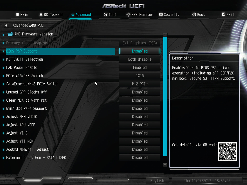 Bei einigen Mainboards für AMD Ryzen ergänzen Updates das BIOS-Setup um die Option „BIOS PSP Support“. PSP steht für Platform Security Processor, den AMD mittlerweile „AMD Secure Technologie“ nennt. Ein im Prozessor integrierter Mikrocontroller vom Typ ARM Cortex-A5 mit TrustZone realisiert dabei Funktionen wie ein Trusted Platform Module (fTPM 2.0), das Microsoft für Windows-10-PCs mit Windows-Logo fordert.
