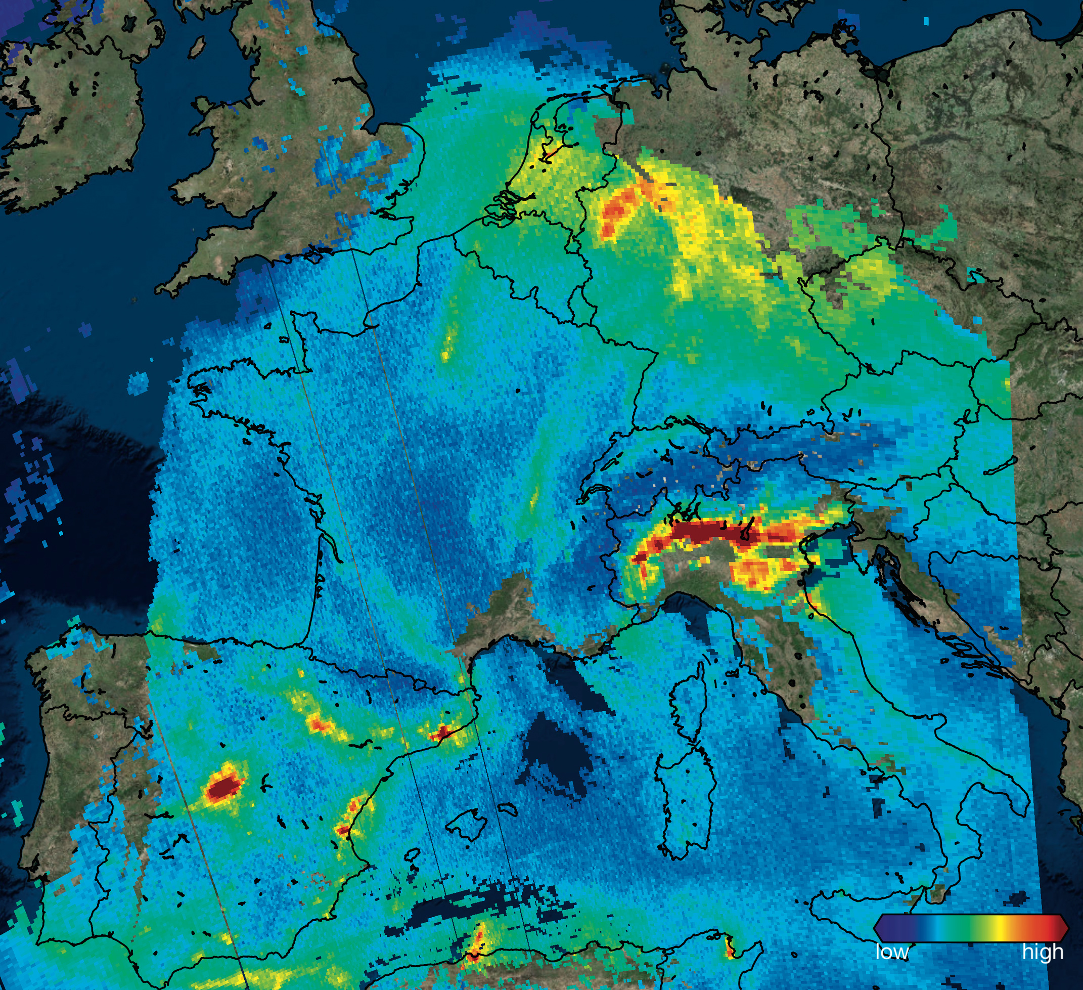 Der Erdbeobachtungssatellit Sentinel-P hat spektakuläre Bilder der Luftverschmutzung über Europa geschickt. Sie zeigen detailliert und großflächig die Stickstoffdioxidverteilung. Einige der gewonnenen Daten tragen auch zur globalen Kohlenmonoxidkarte bei.