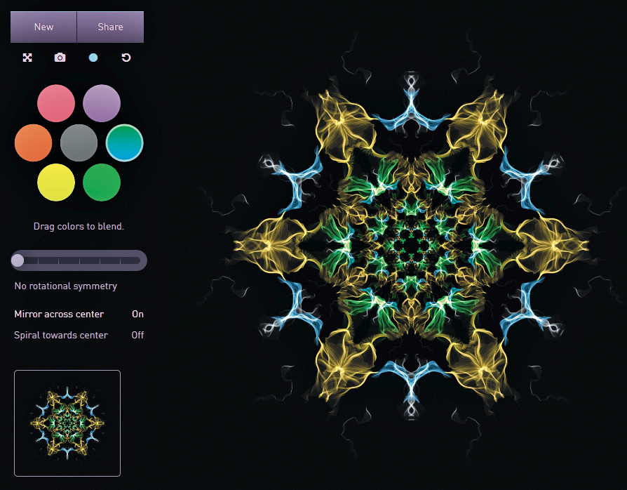 Es macht Spaß, mit den Farben und Symmetrien zu spielen – auch weil die Ergebnisse eine eigene faszinierende Ästhetik haben. Fertige Werke lassen sich abfotografieren oder als Link teilen. Silk stellt unter dem Link nicht einfach das Ergebnis dar, sondern spielt den Entstehungsprozess des Bildes ab. Von Silk gibt es auch eine iOS-App. (jo@ct.de)