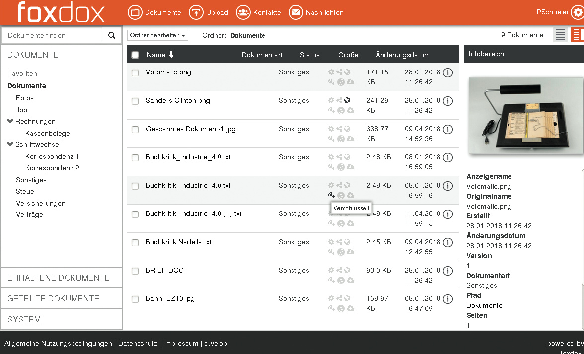 Der Webdienst Foxdox von d.velop verwahrt Dateien in einem anpassbaren Verzeichnisbaum in einem deutschen Rechenzentrum. Er analysiert Dateien auf erkennbare Texte und pflegt einen Index für Volltextsuchen. Ein kostenlos herunterladbares Windows-Programm synchronisiert ausgewählte Foxdox-Verzeichnisse mit der Festplatte, und in der Ausführung DMS integriert sich Foxdox zudem in Outlook, um auch E-Mails samt Anhängen revisionssicher zu speichern.