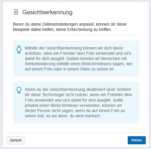 Die europäische Verordnung bedeutet auch für Facebook grundsätzlich weniger Datenerhebung. An einer Stelle hat es der Konzern allerdings geschafft, die neuen Regeln in Richtung mehr Datensammelei auszulegen: Im Rahmen der Umstellungen bringt das Unternehmen die Gesichtserkennung wieder ins Spiel, auf die es in Europa bislang auf Druck von Datenschützern verzichtet hat. Damit markiert es erkannte Nutzer in Fotos automatisch. Jetzt kommt die Gesichtserkennung nach ausdrücklicher Zustimmung der Nutzer wieder zum Einsatz.