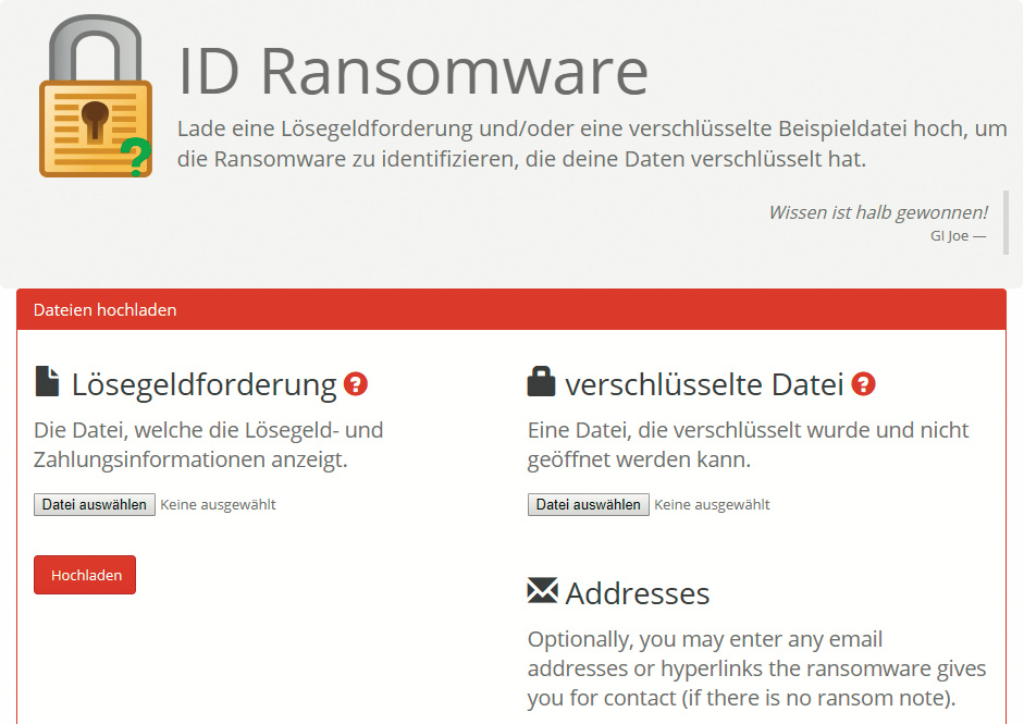 ¯!!! Wenn Sie ein Backup haben, setzen Sie Windows einfach auf einen Zeitpunkt vor der Infektion zurück. Haben Sie keins, schwinden die Chance deutlich, dass Sie jemals wieder Zugriff auf Ihre Daten bekommen. Aber vielleicht gibt es ja bereits eine Möglichkeit, die Daten zu entschlüsseln. Dazu müssen Sie erst mal prüfen, welcher Erpressungstrojaner auf Ihrem Computer zugeschlagen hat. Das ist oft nicht auf den ersten Blick ersichtlich. Um das herauszufinden, laden Sie einfach eine verschlüsselte Datei zum kostenlosen Analysedienst ID-Ransomware (siehe ct.de/y9hg) hoch. Der Service erkennt fast 600 Verschlüsselungstrojaner und neben dem Namen steht im Ergebnis auch, ob es bereits ein Gratis-Entschlüsselungstool gibt. Ist das nicht der Fall, sinken die Chancen abermals drastisch, dass Sie Ihre Daten wieder öffnen können.