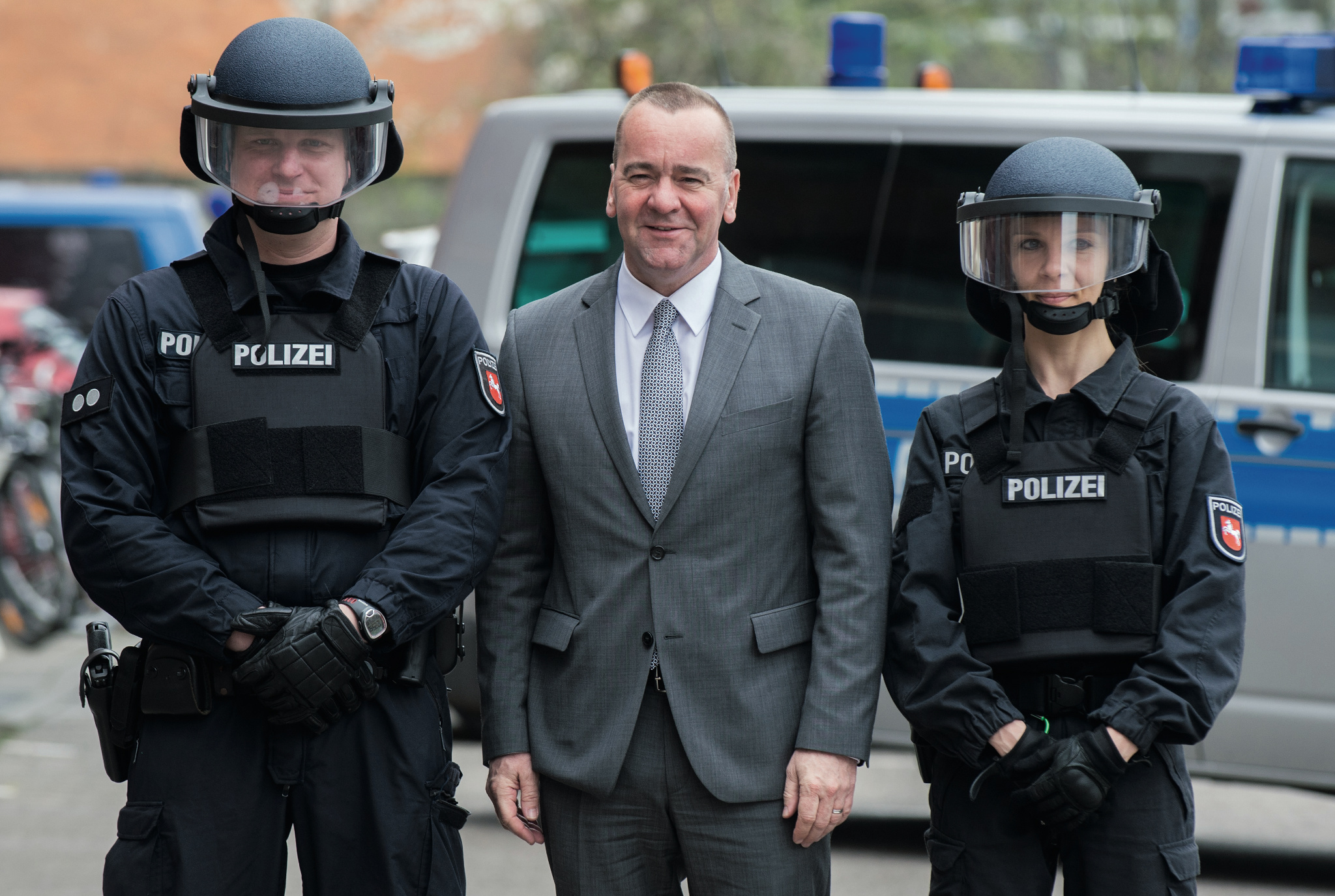 Die rot-schwarze Landesregierung in Hannover hat einen Entwurf zur Reform des Polizeigesetzes in den Landtag eingebracht, in dem sich viele Parallelen zum bayerischen Vorreiter finden (siehe c’t 6/2018, S. 34). Der niedersächsische Innenminister Boris Pistorius (Bildmitte) betont, dass die Regierung „auf eine möglichst ausgeprägte Balance zwischen Freiheit und Sicherheit geachtet“ habe. Offenbar möchte er den Ball flach halten, nachdem in München 30.000 Gegner vom Bündnis „NoPAG“ gegen das bayerische Polizeiaufgabengesetz (PAG) demonstriert hatten.