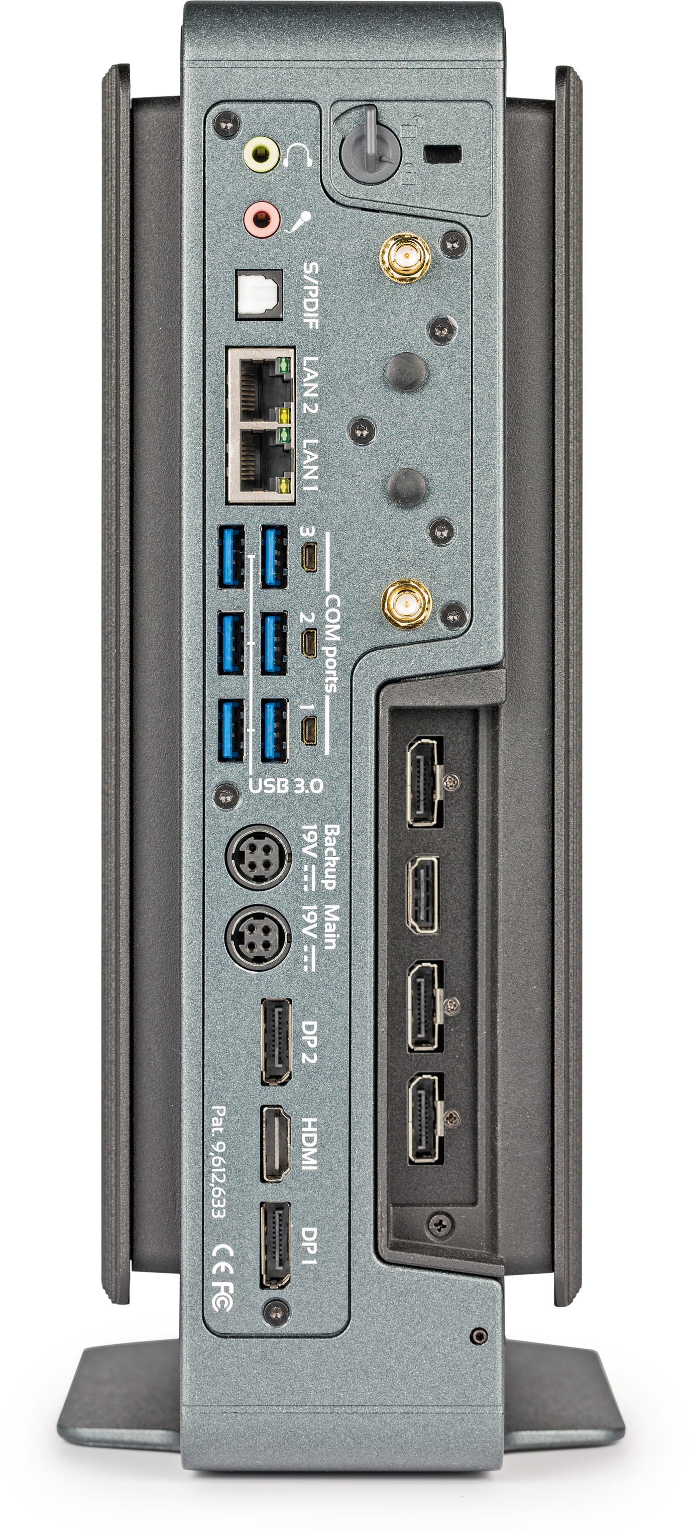 Vier RAM-Riegel und eine Grafikkarte passen ins Innere, dazu je nach Konfiguration ein oder zwei Steckplätze für LTE-Module mitsamt Micro-SIM-Slots. Zwei M.2-Slots nehmen schnelle PCIe-SSDs auf, der Laufwerkskäfig davor dient gleichzeitig als deren Kühlkörper und bietet vier 2,5"-SATA-Medien Platz. Zwei Gigabit-Ethernet-Anschlüsse gehören zur Standardausstattung, WLAN gibt es gegen Aufpreis.