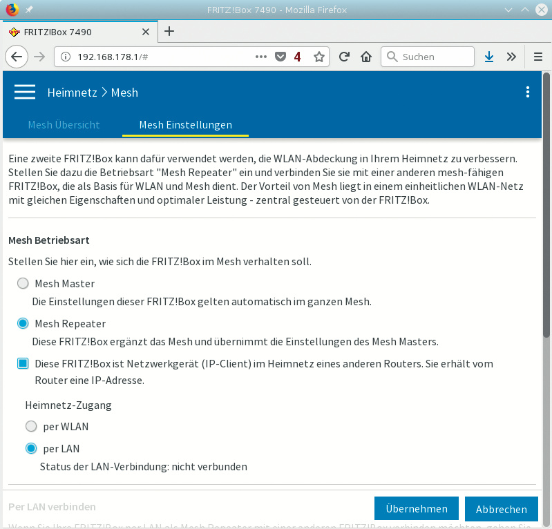Die frühere Heimnetzübersicht heißt bei FritzOS 7 nur noch Mesh. Hier gibt es den neuen Reiter Mesh-Einstellungen, wo man die Rolle einer Fritzbox im Heimnetz wählt. Schon früher liefen die Boxen auch als Mesh-WLAN-Repeater, doch mit Fritz-OS 7 können sie parallel auch als Telefonie-Repeater arbeiten, egal ob sie per LAN oder WLAN angebunden sind.