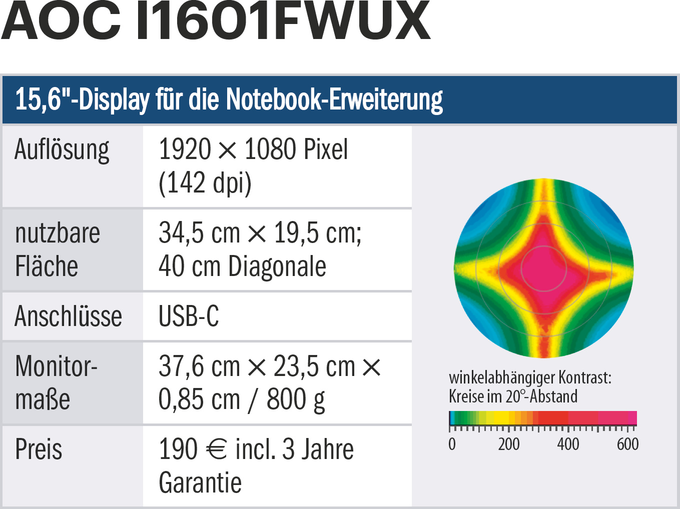 Der 15,6-zöllige Monitor (40 cm Diagonale) bringt auf seiner knapp 35 cm × 20 cm großen Schirmfläche 1920 × 1080 Pixel unter. Er wird per USB-C ans Notebook angeschlossen, bekommt darüber die Videoinformationen und braucht keine eigene Stromversorgung. Betreibt man ihn im erweiterten Desktop-Modus, kann man ihn zusätzlich zu der Notebook-eigenen Bildfläche nutzen.