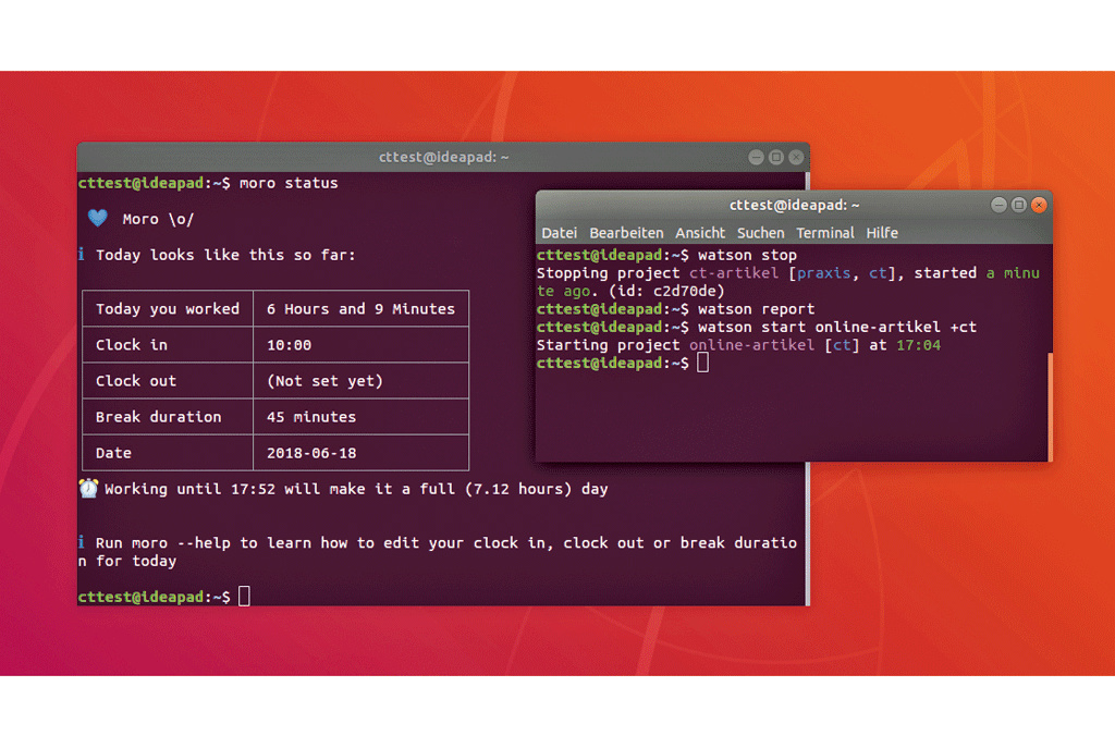 Wie viele Stunden sind in der letzten Woche angefallen? Wie viel Zeit hat ein bestimmtes Projekt beansprucht? Um diese Fragen zu beantworten, müssen Sie die Arbeitszeit dokumentieren. Die Programme Moro und Watson erledigen die Aufgabe ohne viel Schnickschnack auf der Kommandozeile. Sie starten eines der Tools mit einem Konsolenbefehl bei Arbeitsbeginn und beenden die Aufzeichnung bei Feierabend. Die Software berechnet dann die aufgewendete Arbeitszeit.