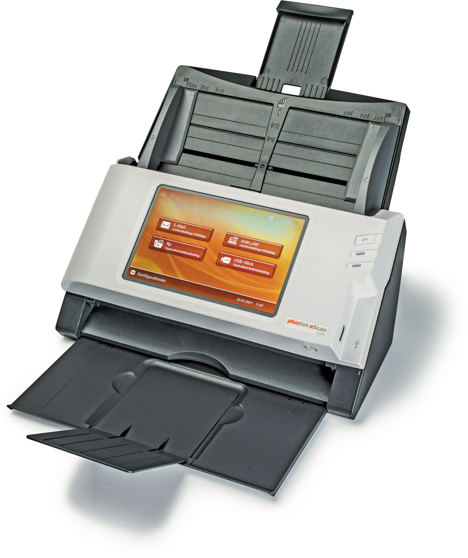 Das Kunststoffgehäuse des eScan A250 macht einen robusten Eindruck. Sein Einzug für 50 Blatt enthält zum gleichzeitigen Digitalisieren beider Dokumentseiten zwei Scanzeilen. Den Großteil der Frontseite nimmt der große 17,8-cm-Touchscreen ein, über den der Scanner bedient wird. Die einzige Taste dient dazu, das Gerät in den Ruhezustand zu versetzen.
