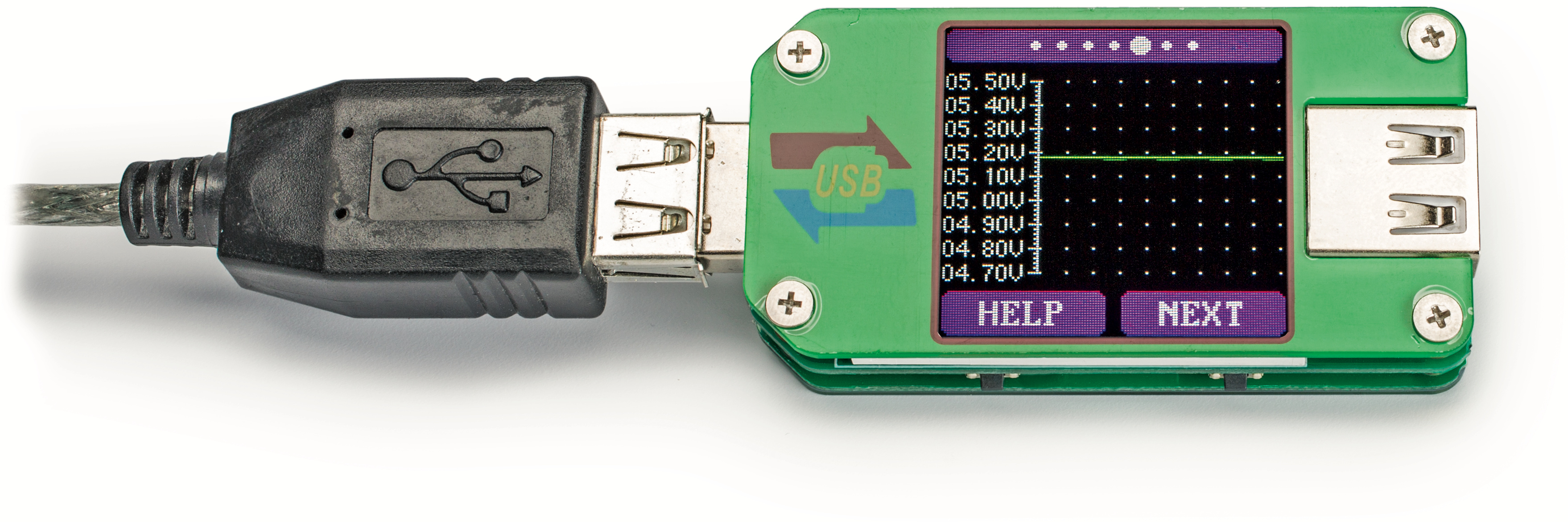 Der Messadapter von Ruideng Technology besteht aus zwei Platinen und einer Trägerplatte für das 3,7-cm-Farbdisplay, die in Sandwich-Bauweise fest verschraubt sind. Ein geschlossenes Gehäuse hat der chinesische Hersteller eingespart. An eine Spannungsquelle mit USB-Ausgang (PC, Ladegerät oder Powerbank) gesteckt, startet der Messadapter und zeigt Spannung, Strom, Leistung, die Impedanz des angeschlossenen Kabels, die Temperatur und die bisher an das angeschlossene Gerät übertragene Energie in mWh oder mAh (Kapazität) an.