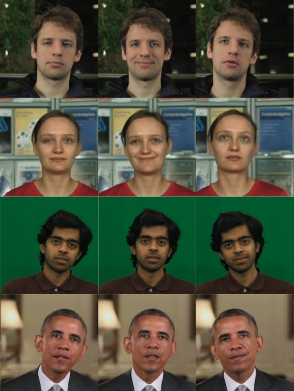 Um im Vergleich zu früheren Verfahren noch überzeugender Gesichter auszutauschen, programmierten die Forscher einiges an menschlichem Vorwissen in ihren Algorithmus: Der passt nämlich zuerst ein aus 3D-Scans erzeugtes Gesichtsmodell an die Form, Textur, Mimik, Kopfdrehung und Beleuchtungssituation des Quell- und Zielgesichts an. Die Forscher können nun nach Belieben Parameter von einem Gesicht auf das andere übertragen, beispielsweise die Mimik oder die Kopfdrehung. Mit diesem 3D-Modell lässt sich leicht ein Farbbild des Gesichts berechnen. Dem fehlt aber der Hintergrund. Außerdem wirkt es wie eine Figur aus einem Computerspiel.