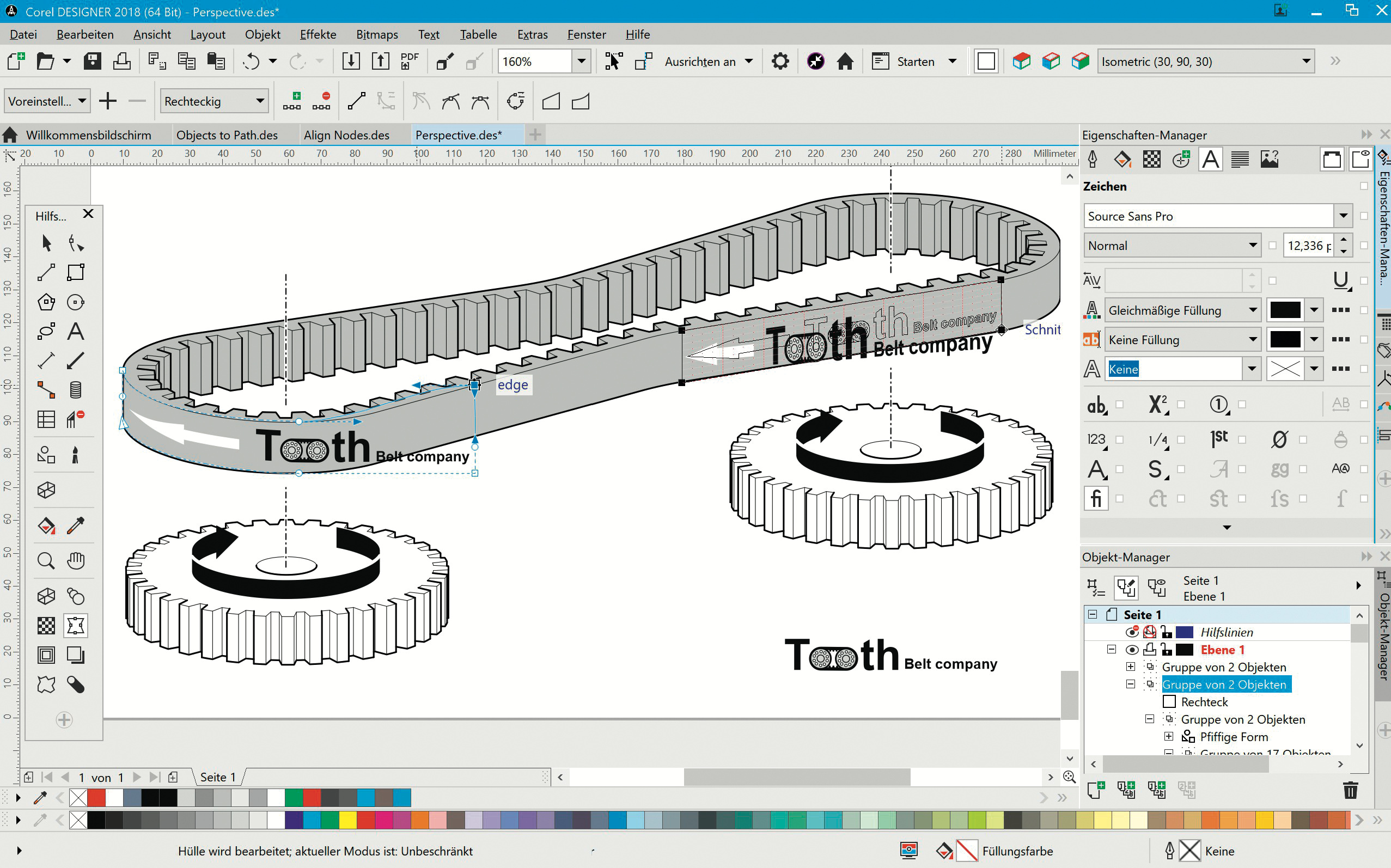 Die Technical Suite enthält alle Neuerungen, die auch die Programme der CorelDraw Graphics Suite 2018 bieten, also CorelDraw, Photo Paint, Font Manager, PowerTrace und AfterShot 3 HDR. Dazu gehört die Funktion, Objekte gleichmäßig an Strecken auszurichten, etwa um Zahnriemen zu erstellen. Hüllen- und Perspektiveffekte richten Vektorgrafiken und Bitmap-Bilder an anderen Objekten aus. Der Symmetriezeichenmodus lässt sich in isometrischer Perspektive nutzen, beispielsweise um auf die Schnelle gleichmäßige Felgen zu erzeugen.