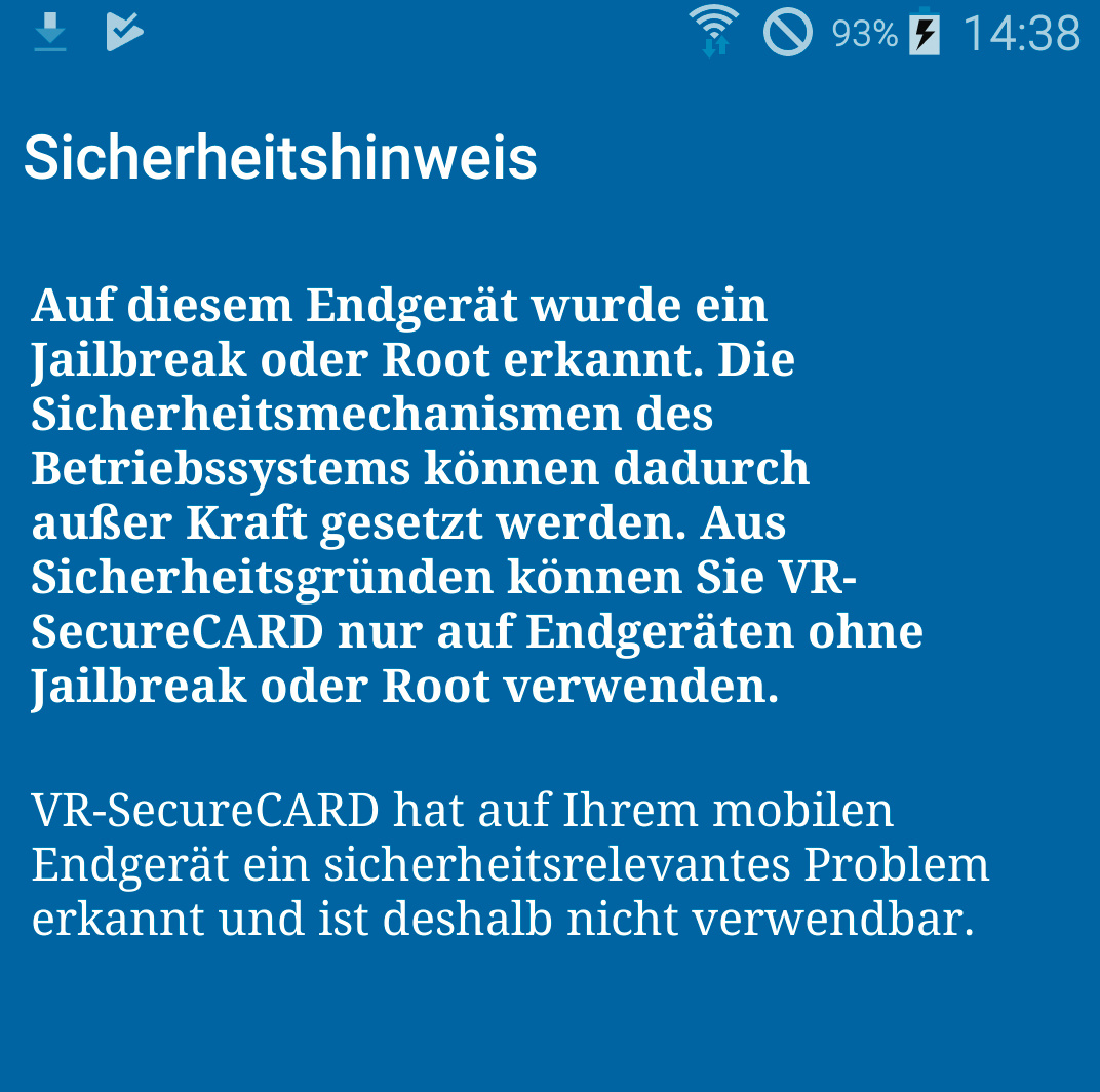 ¯!!! Falls Sie ein Android-Gerät für das Online-Banking nutzen wollen, sollten Sie das Rooten lieber unterlassen – nicht nur, weil es dann offen steht für Android-Malware, sondern weil Banken dieses Gefahrenpotenzial natürlich kennen und deshalb zumindest in ihren allgemeinen Geschäftsbedingungen in der Regel die Nutzung ihrer Banking-Apps auf gerooteten Geräten untersagen. Manche Apps können auch feststellen, ob ein Gerät gerootet ist und verweigern dann den Start.