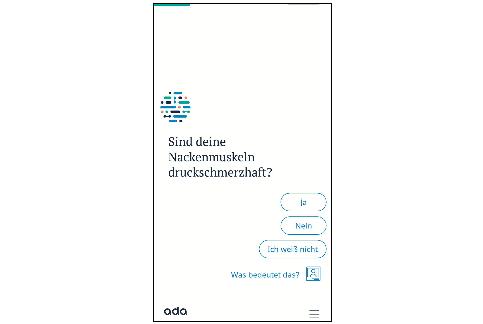 Der Nutzer antwortet mit Ja oder Nein, ab und zu verlangt Ada auch Angaben zur Dauer der Symptome. Zu den Antwortmöglichkeiten kommt häufig noch der Button „Was bedeutet das?“, der den Nutzer zu Erklärungen führt. Für Nichtmediziner ist die Funktion sehr praktisch, denn darin ist bildlich hinterlegt, wo beispielsweise die Kiefermuskulatur liegt und wie der Nutzer überprüfen kann, ob sie druckschmerzhaft ist.