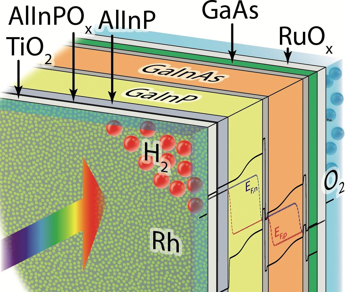 Für ihren Erfolg erweiterten die Forscher eine sogenannte Tandemzelle aus Materialien der chemischen Hauptgruppen III und V. Sogenannte III-V-Halbleiter verbinden Elemente der III. Gruppe des Periodensystems wie zum Beispiel Aluminium, Gallium und Indium mit Elementen der V. Gruppe wie Phosphor, Arsen oder Antimon. Die zur Wasserspaltung konzipierte Tandemzelle besteht hauptsächlich aus einer Schicht Gallium-Indium-Phosphor und einer Schicht Gallium-Indium-Arsen.
